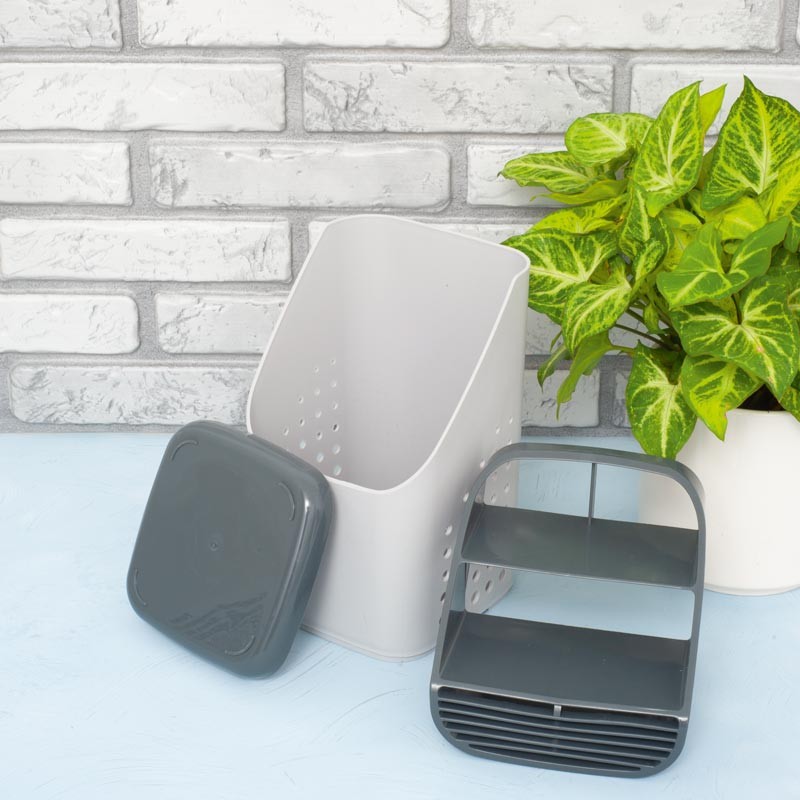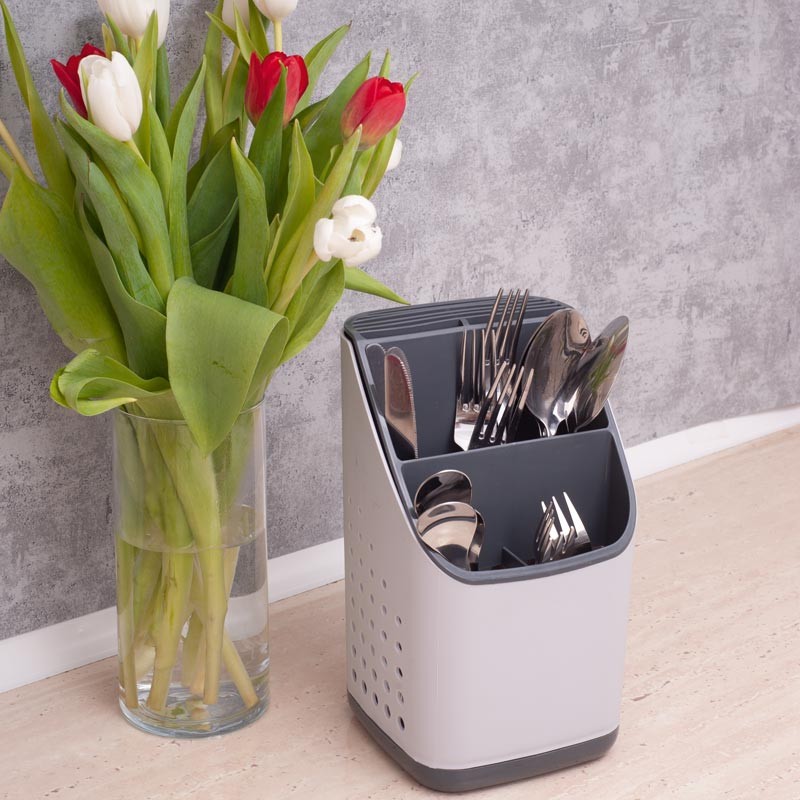Are o bază detaşabilă, unde se scurge apa - tacâmurile nu stau în apă.