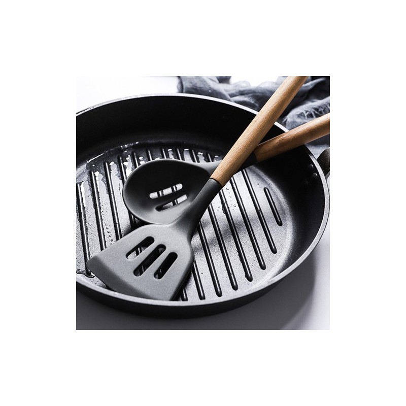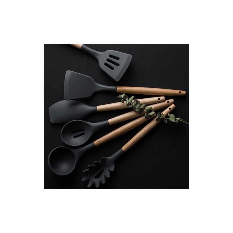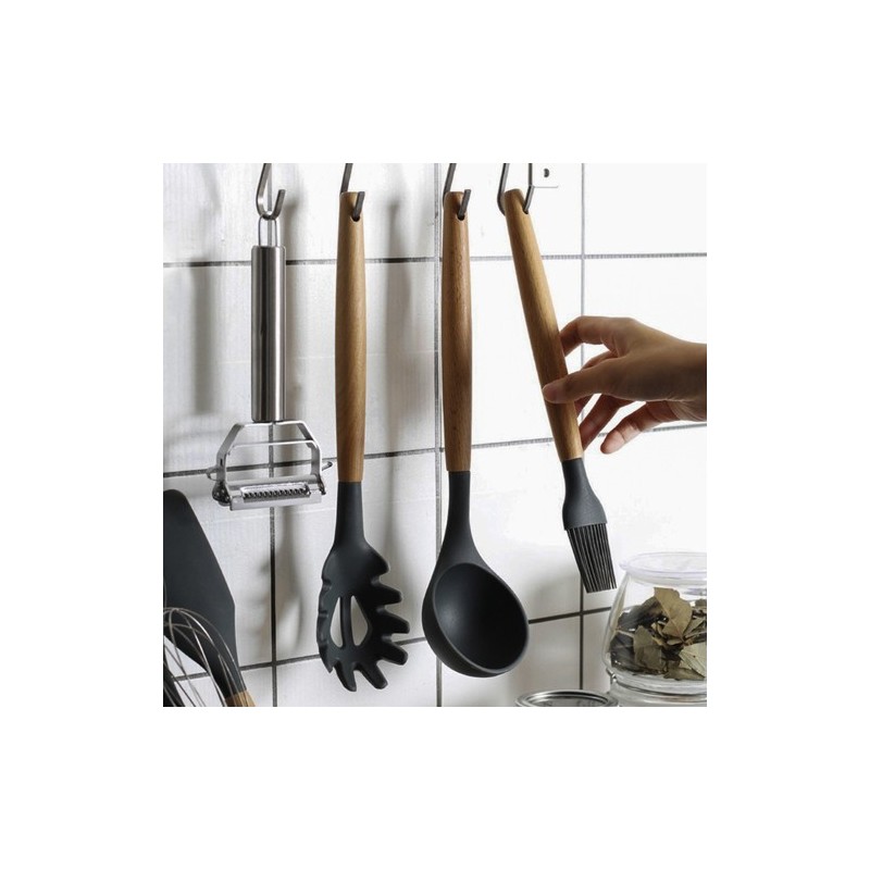 Găteşte cu stil - un set de accesorii de bucătărie din silicon într-un suport elegant! Un set care facilitează gătitul. Accesorii rezistente la temperaturi de până la 230 °C, durabile şi uşor de curăţat - indispensabile în orice bucătărie!