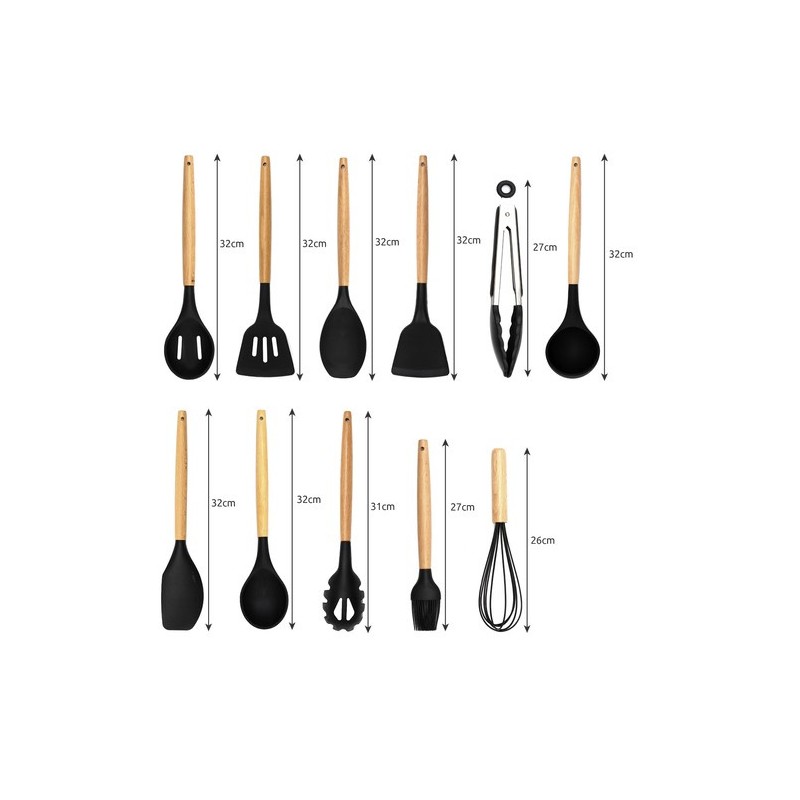 Setul include: lingură cu fante, spatulă, lingură pentru tort, spatulă rotundă, lingură, lingură cu fante, lingură pentru paste, pensulă de patiserie, cleşte, polonic, tel, scurgător/tavă pentru tacâmuri.