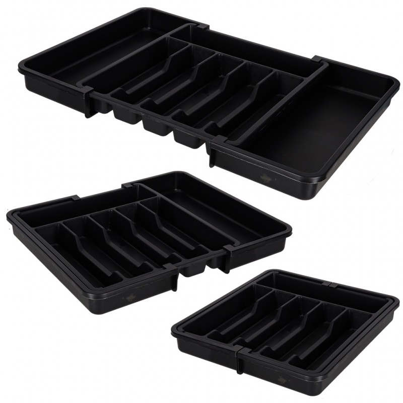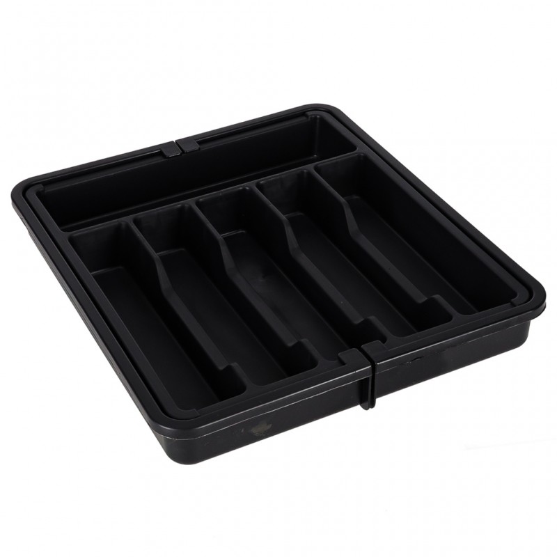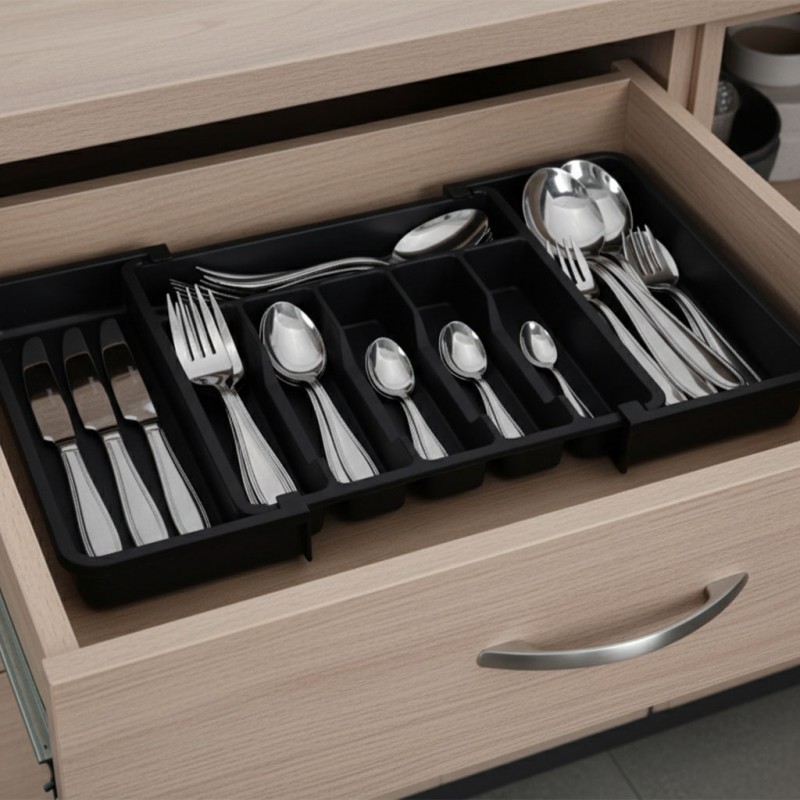 Organizatorul este realizat din material plastic de calitate, gândit pentru utilizare frecventă în bucătărie. Construcţia solidă ajută la limitarea uzurii şi a murdăririi, iar forma inserţiei protejează interiorul sertarului împotriva zgârieturilor şi frecării. Structura extensibilă şi modulară permite ajustarea lăţimii la dimensiunea sertarului, astfel încât fiecare centimetru să fie folosit cât mai eficient. Întregul produs este proiectat cu accent pe funcţionalitate şi confortul utilizatorului.