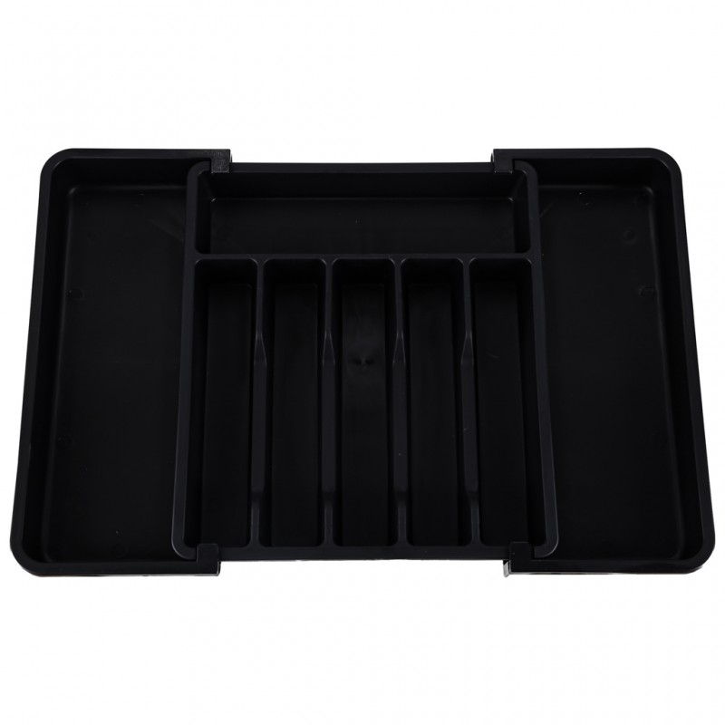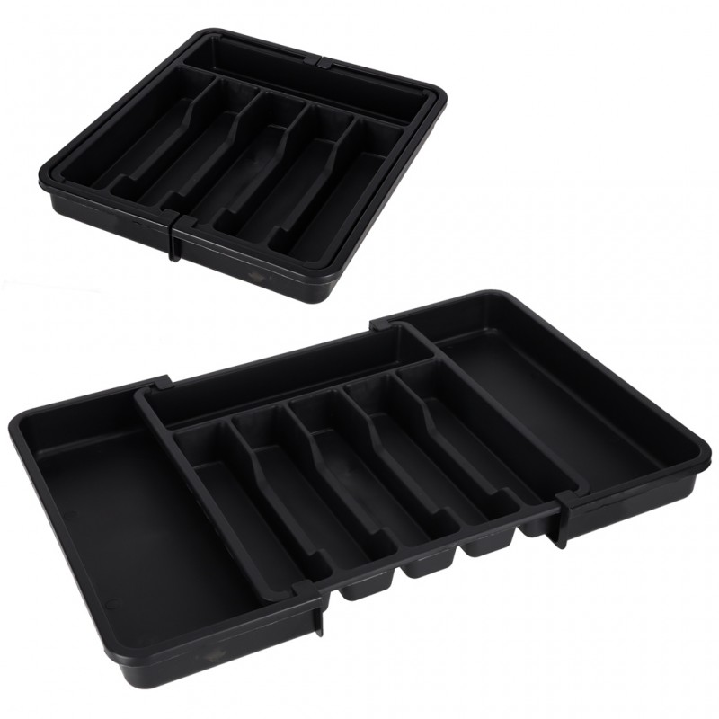 Organizator extensibil pentru tacâmuri în sertar, cu lăţime reglabilă 33-56,5 cm, 8 compartimente şi din material plastic de calitate, care protejează interiorul sertarului.