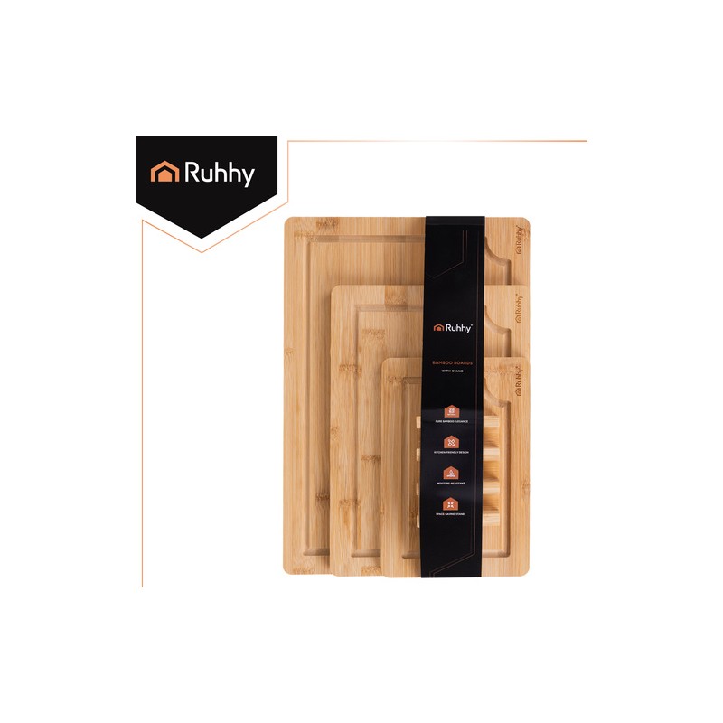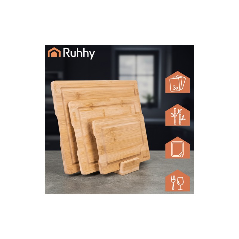 Set de 3 tocătoare din bambus cu suport, ca să alegi rapid dimensiunea potrivită pentru fiecare ingredient. Şanţurile pentru lichide păstrează blatul mai curat, suprafaţa din bambus este prietenoasă cu lamele, iar suportul ajută la depozitare ordonată şi igienică.