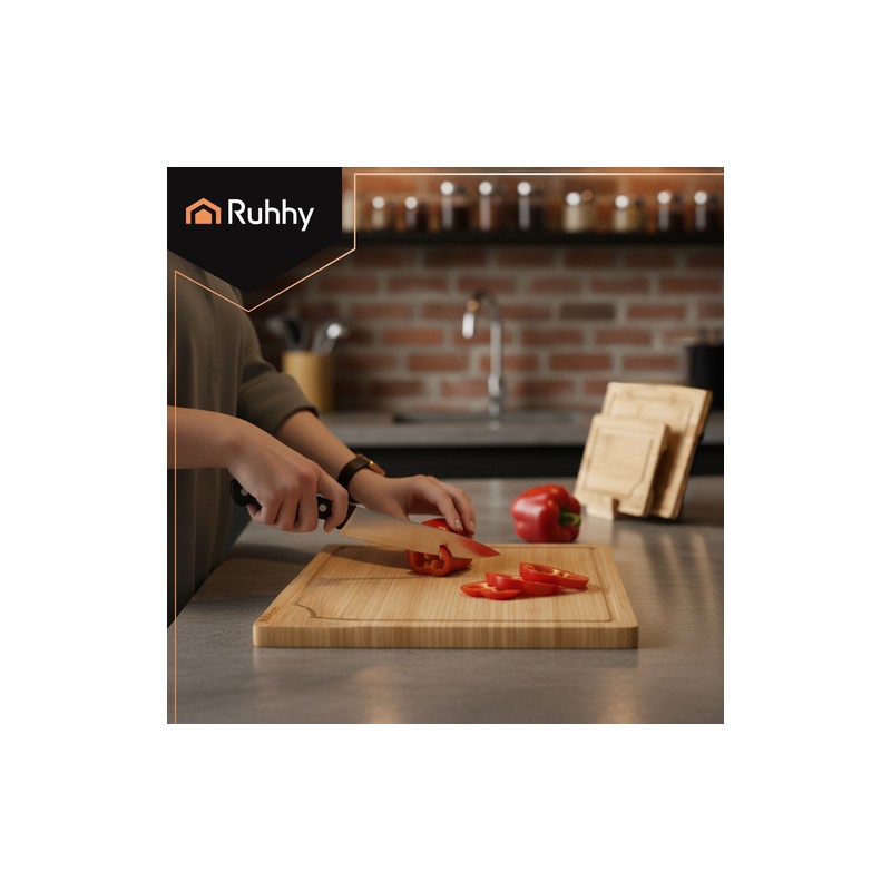 Un set practic pentru gătit mai organizat şi servire mai elegantă. Primeşti 3 tocătoare în dimensiuni diferite, astfel încât alegi uşor suprafaţa potrivită în funcţie de ingrediente şi îţi separi mai comod utilizarea. Suportul inclus rezolvă depozitarea: tocătoarele au locul lor, într-un mod estetic şi igienic, fără aglomeraţie în sertare. Şanţurile pentru scurgerea lichidelor ajută la păstrarea ordinii pe blat, reţinând sucul de la legume, fructe sau carne. Suprafaţa din bambus este prietenoasă cu cuţitele, iar utilizarea pe ambele feţe creşte durata de viaţă şi flexibilitatea în bucătărie. Tocătoarele sunt rezistente la umiditate, se usucă rapid şi nu absorb mirosurile, fiind potrivite atât pentru tăiere, cât şi pentru servire.
