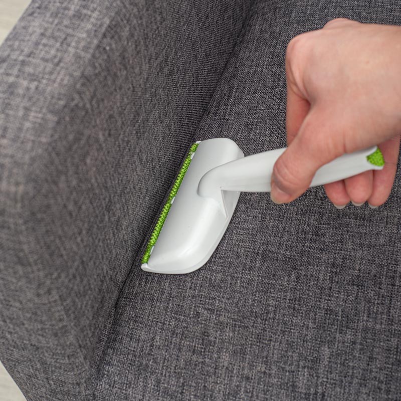 Perie dublă pentru ţesături, care ajută la îndepărtarea firelor, a aţelor, a scamelor şi a murdăriei din zonele greu accesibile ale hainelor, de exemplu lângă buzunare (14 x 10 cm).