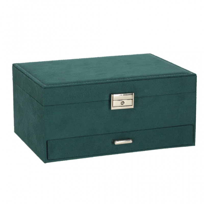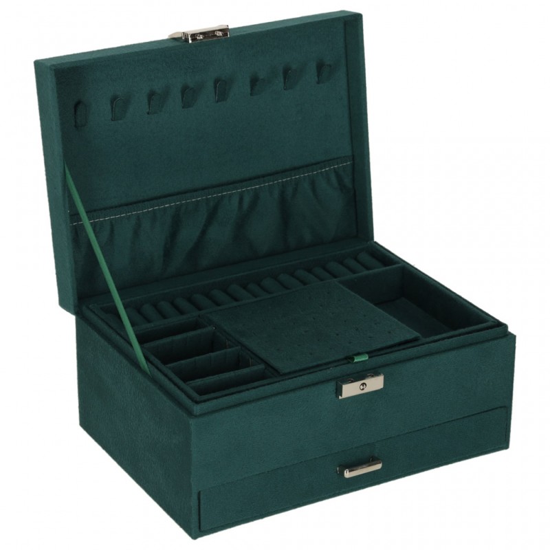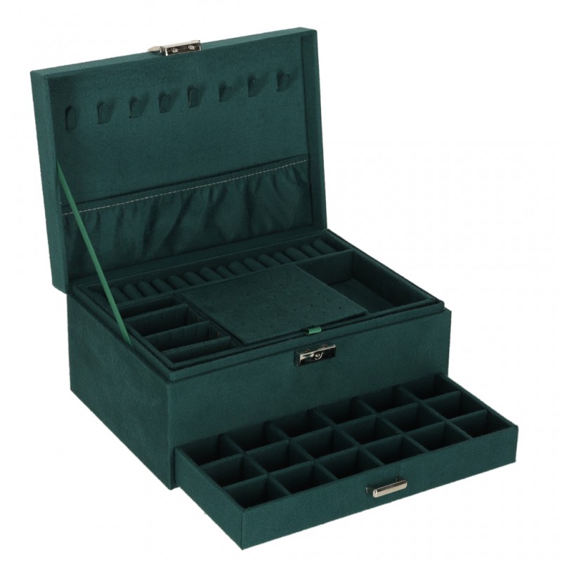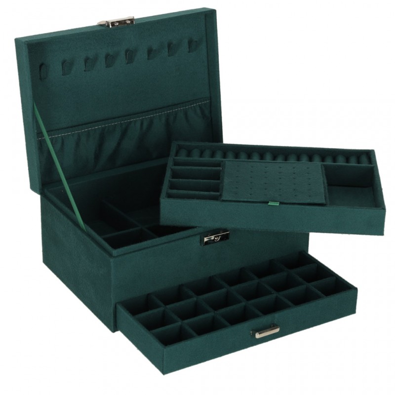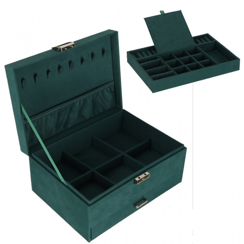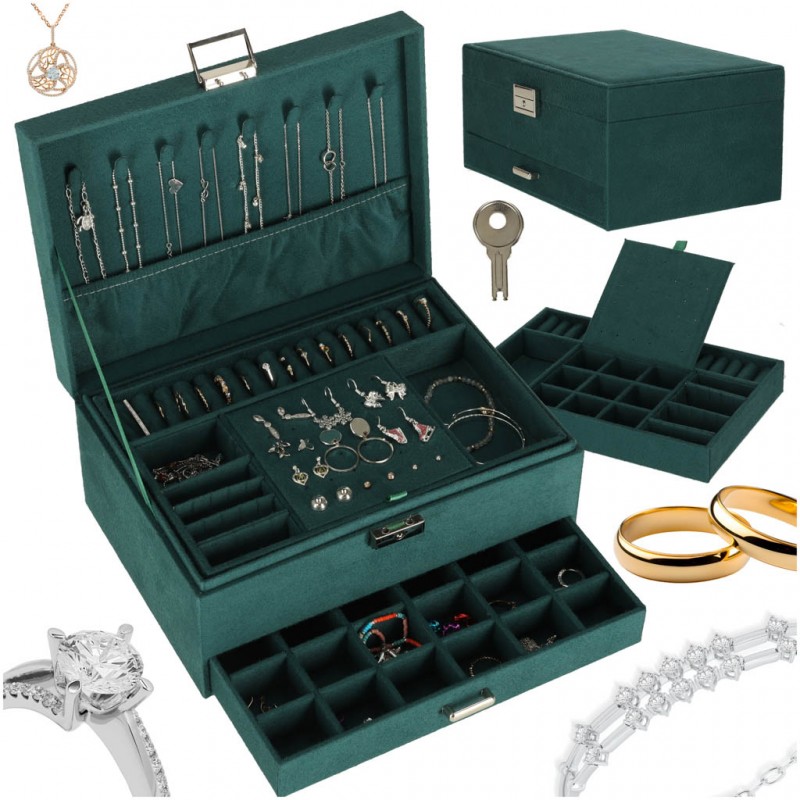 Asiguraţi-vă o depozitare elegantă pentru accesoriile dvs. Organizatorul de bijuterii de un verde intens vă va ajuta să vă păstraţi piesele preferate ordonate şi protejate. Numeroasele compartimente, cârlige şi perforaţii facilitează sortarea inelelor, colierelor şi cerceilor, în timp ce încuietoarea cu cheie asigură discreţia.