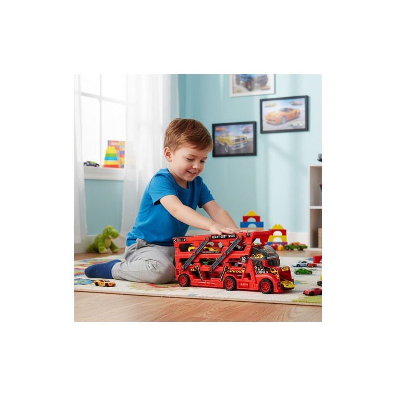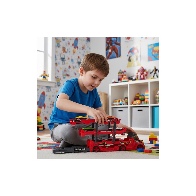 Camionul TIR cu lansator şi 6 maşinuţe oferă copiilor o experienţă realistă din lumea auto. Realizat din plastic şi metal de înaltă calitate, cu platformă pe 3 niveluri pentru transport şi depozitare, setul permite organizarea curselor pline de adrenalină. Lansatorul acţionat prin buton adaugă dinamism şi emoţie jocului.