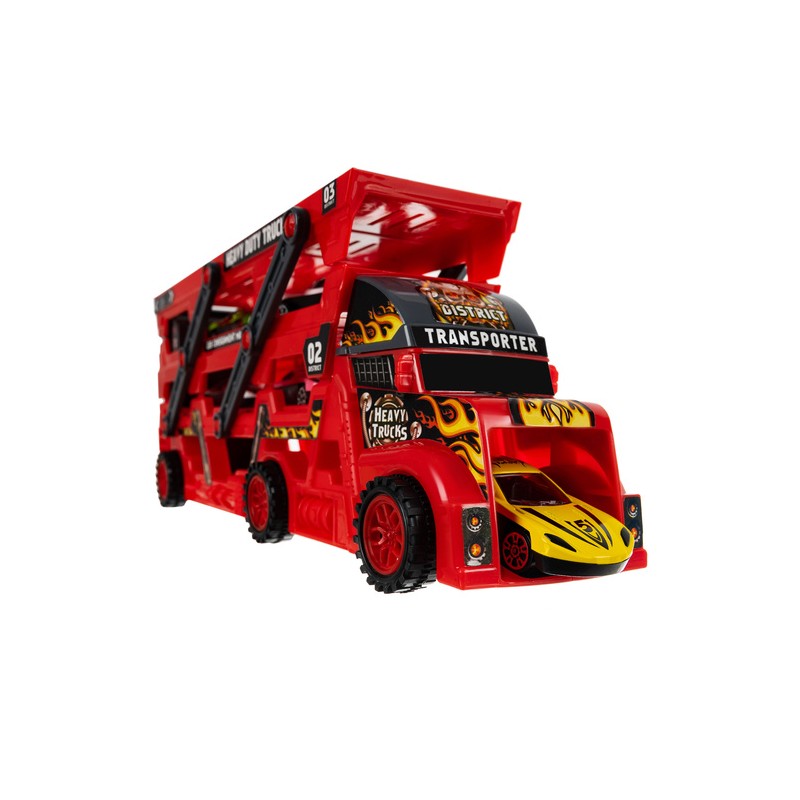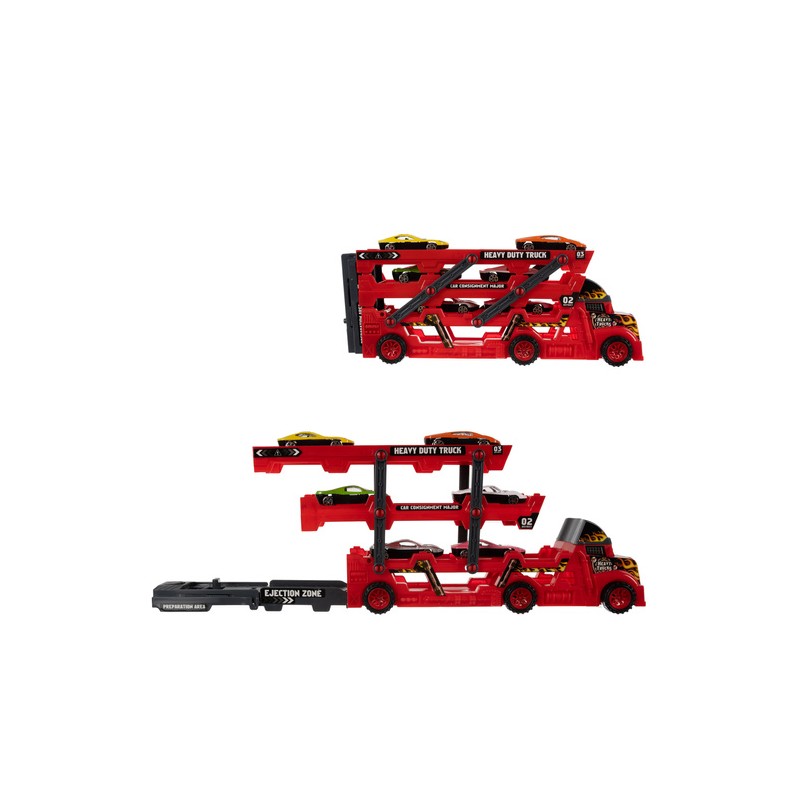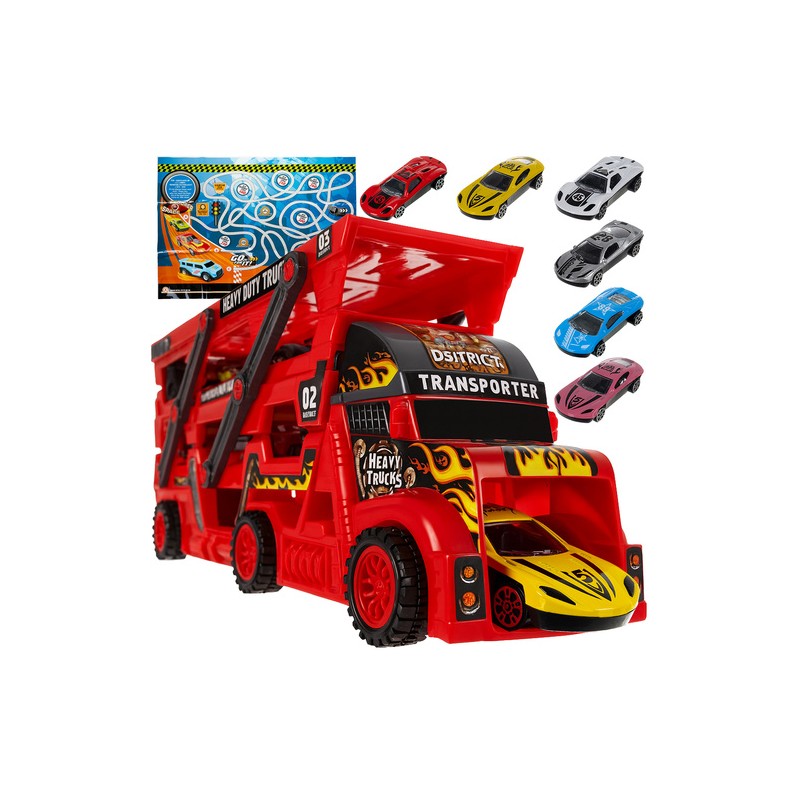 Setul este realizat din material plastic PP de înaltă calitate şi metal (aliaj de zinc), ceea ce asigură un aspect realist şi o utilizare de durată. Construcţia solidă a camionului şi a maşinuţelor rezistă solicitărilor obişnuite din timpul jocului. Maşinuţele licenţiate reproduc fidel vehicule reale şi îi încurajează pe copii să îşi creeze propria colecţie auto.