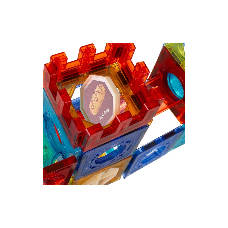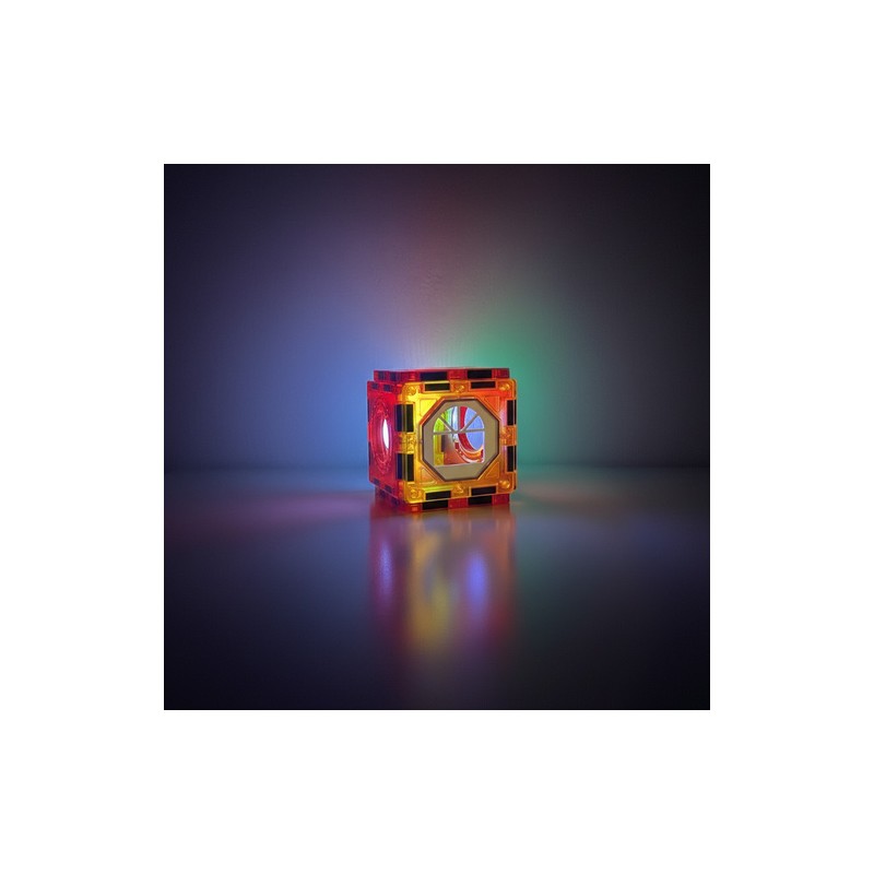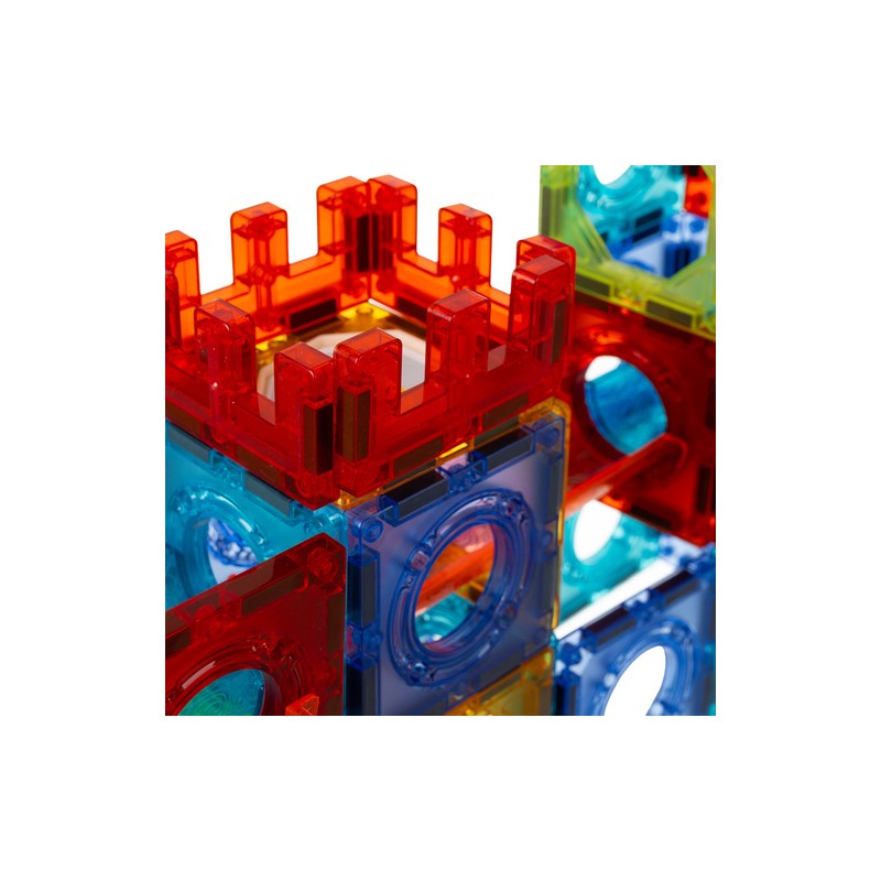 Piesele setului sunt realizate din plastic rezistent şi netoxic, uşor de curăţat. Magneţii puternici asigură îmbinări stabile între panouri şi elementele pistei pentru bile, astfel încât construcţiile rămân solide în timpul jocului. Setul include, de asemenea, elemente cu lumină LED, bile, piese magnetice pentru pistă, precum şi unelte şi accesorii concepute cu rol educativ. Cutia colorată facilitează depozitarea pieselor după încheierea jocului.