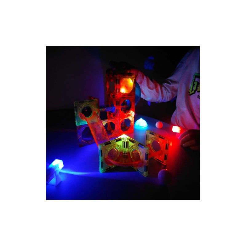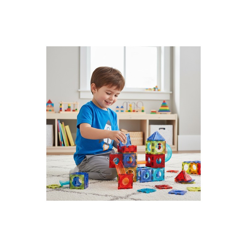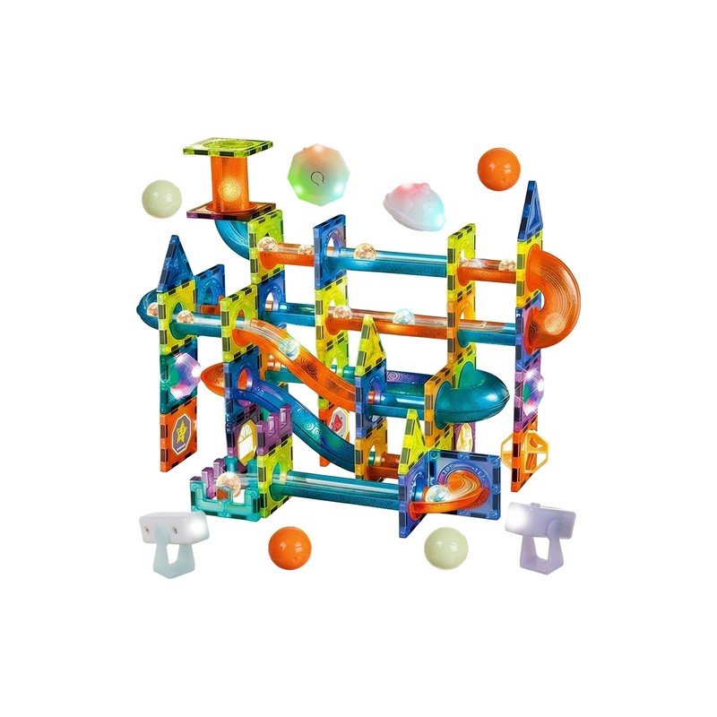 Setul de construcţie magnetic 3D cu pistă pentru bile include 110 piese cu magneţi puternici, LED şi panouri colorate pentru turnuri, poduri şi tobogane. Copiii îşi dezvoltă imaginaţia, gândirea logică şi motricitatea fină, iar plasticul durabil, netoxic, conform normelor europene, susţine o joacă sigură şi creativă.