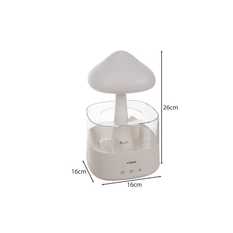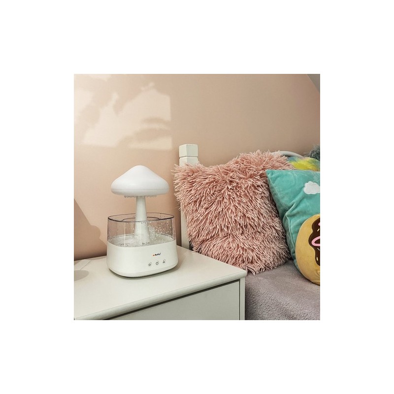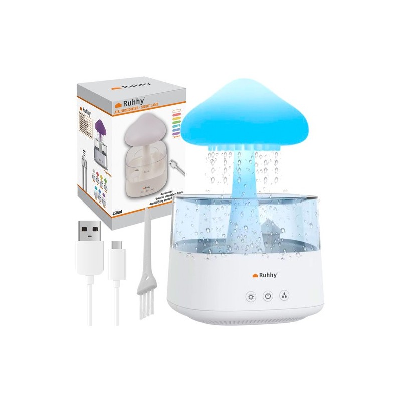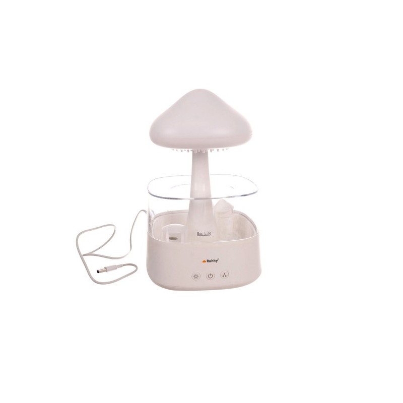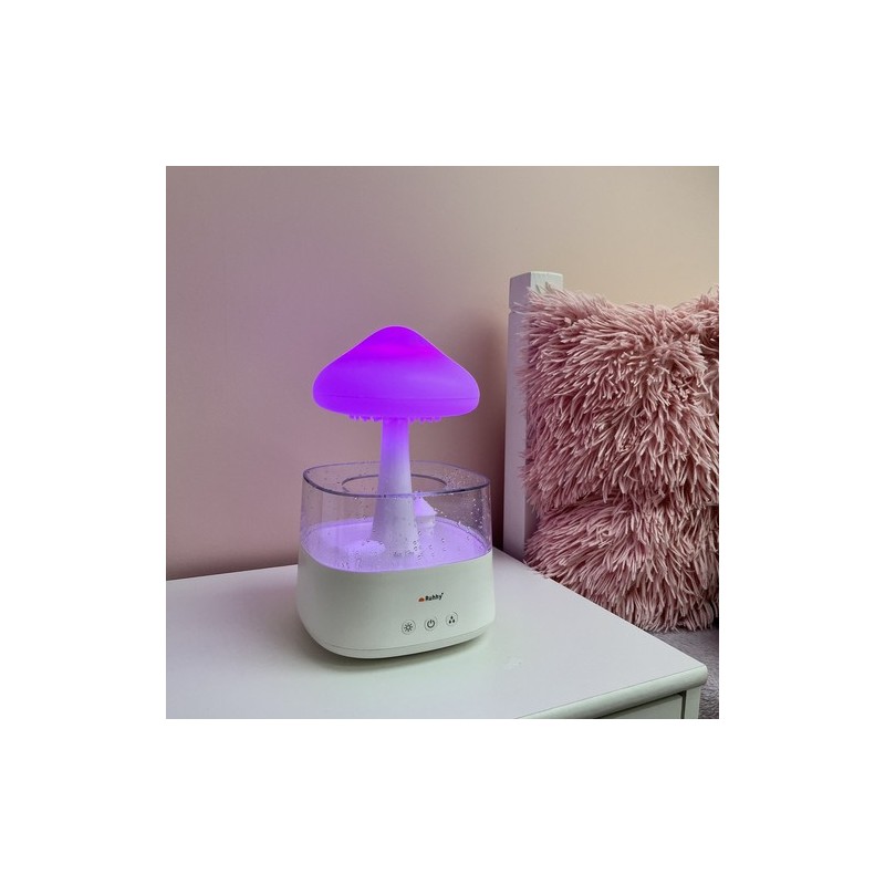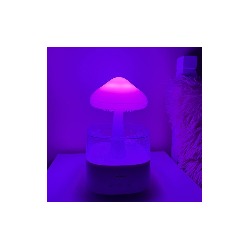 Umidificatorul în formă de ciupercă combină umidificarea aerului cu o lampă de noapte LED decorativă şi un efect relaxant de ploaie. Cele trei moduri de ploaie – fără ploaie, ploaie uşoară şi ploaie puternică – permit adaptarea efectului vizual şi a sunetului de „zgomot alb” (aprox. 30–50 dB) la atmosfera dorită. Cantitatea de abur poate fi reglată, iar apa circulă într-un circuit închis. Prin adăugarea câtorva picături de ulei esenţial, dispozitivul poate fi folosit şi pentru aromaterapie.