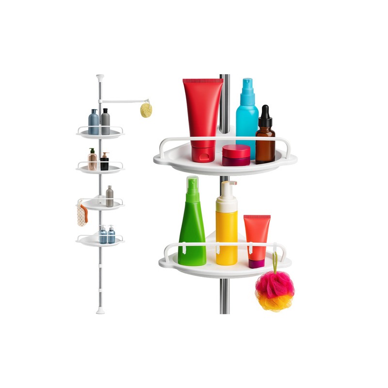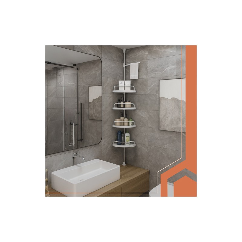 Raftul de baie telescopic de colţ te ajută să menţii ordinea în cabina de duş şi în întreaga baie. Înălţimea reglabilă, de aproximativ 240–310 cm, permite ajustarea barei la diferite spaţii, fără găurire şi fără efort suplimentar. Cele patru niveluri, suportul pentru prosop şi cârligele suplimentare oferă loc comod pentru depozitarea cosmeticelor, bureţilor, prosoapelor şi a accesoriilor de baie, astfel încât tot ce ai nevoie la duş este la îndemână.