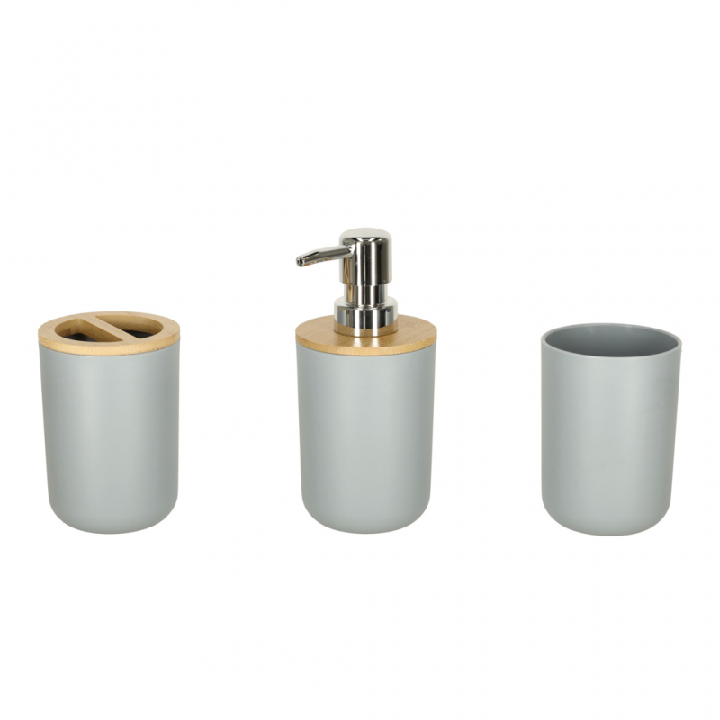 Acest set de baie îmbină designul minimalist cu funcţionalitatea de zi cu zi. Primeşti un set complet de 6 accesorii care te ajută să menţii ordinea în baie: recipient pentru săpun, suport pentru periuţe, pahar, săpunieră, perie şi coş de gunoi. Aspectul unitar al tuturor elementelor facilitează crearea unui spaţiu ordonat şi armonios, iar detaliile din lemn adaugă căldură şi un caracter natural încăperii.