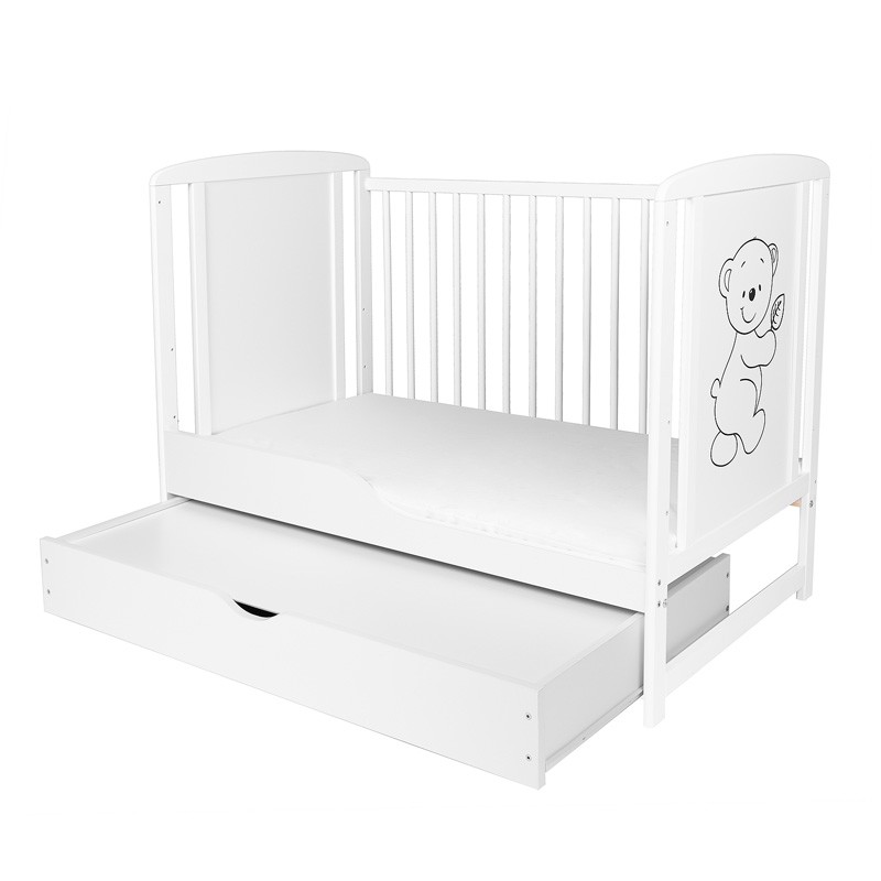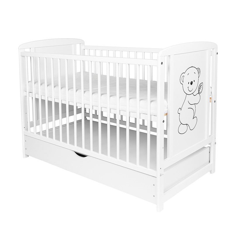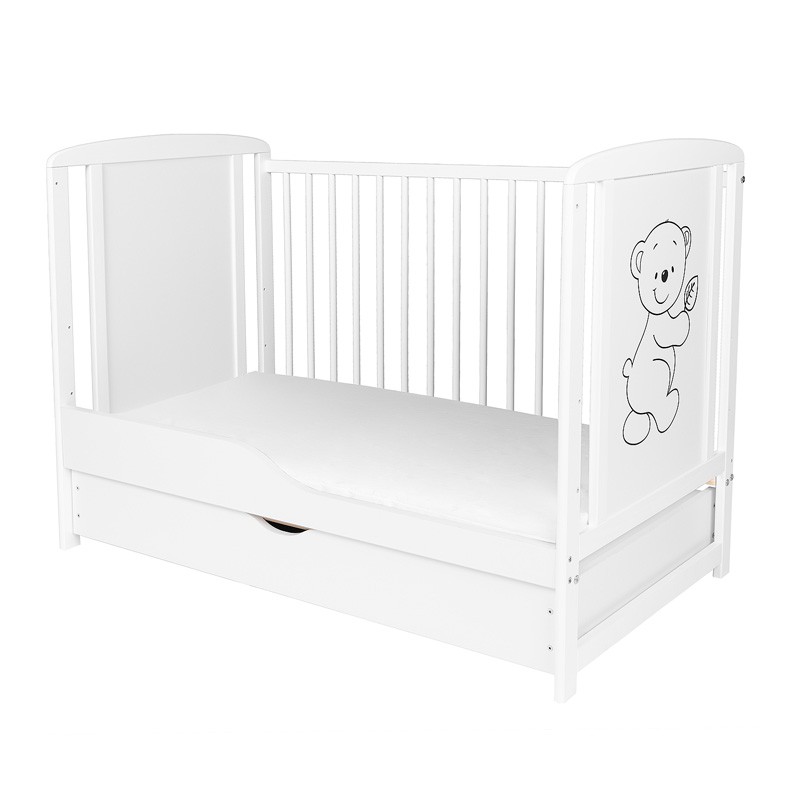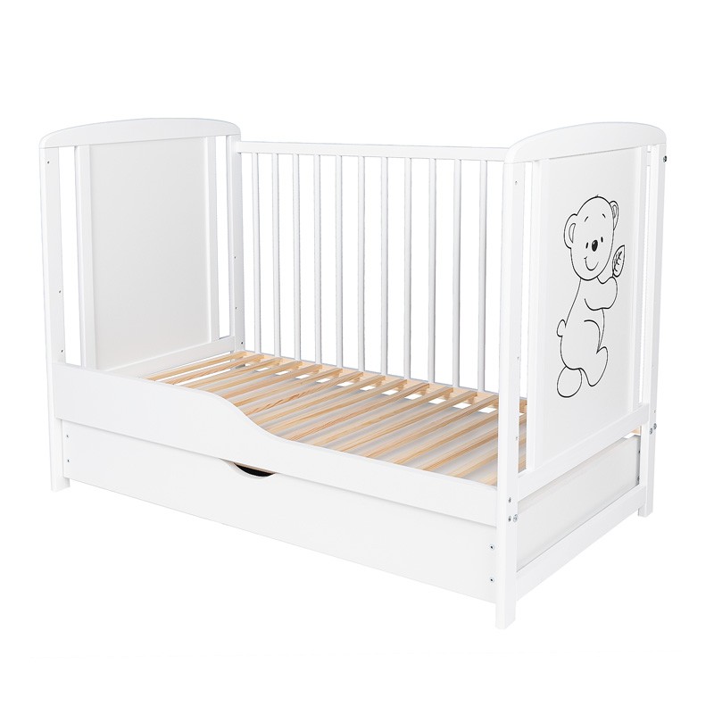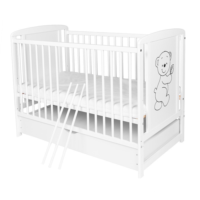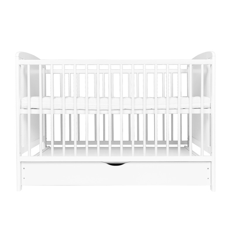 Pătuț pentru copii din lemn de pin clasa I, cu bază reglabilă pe 3 niveluri, 3 bare detașabile și pregătire pentru sertar din lemn, în culoare albă, pentru saltea 120 x 60 cm.