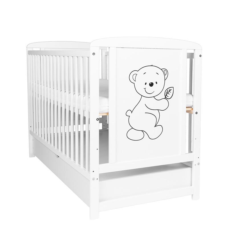 Pătuțul este disponibil în culoare albă, ușor de integrat în diverse amenajări de cameră pentru copii. Nuanța de alb se potrivește atât cu tonuri pastelate, cât și cu accente mai intense. Imprimarea cu girafă sau ursuleț pe placa HDF conferă pătuțului un caracter ludic, potrivit pentru cei mici. Forma simplă și culoarea neutră permit asocierea pătuțului atât cu mobilier clasic, cât și cu piese moderne și cu textile variate.