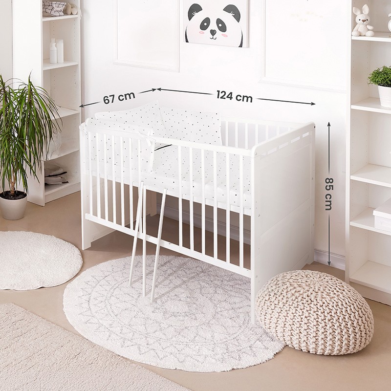Pătuțul este disponibil în culoare albă, ușor de integrat în diferite stiluri de amenajare a camerei copilului. Albul oferă un fundal neutru, care se potrivește atât cu nuanțe pastelate, cât și cu accente mai intense. Forma simplă, completată de detalii atent realizate, permite utilizarea pătuțului în interioare clasice sau moderne. Funcția de transformare în pat tip canapea ajută ca piesa de mobilier să rămână în armonie cu camera copilului pe o perioadă mai lungă de timp.