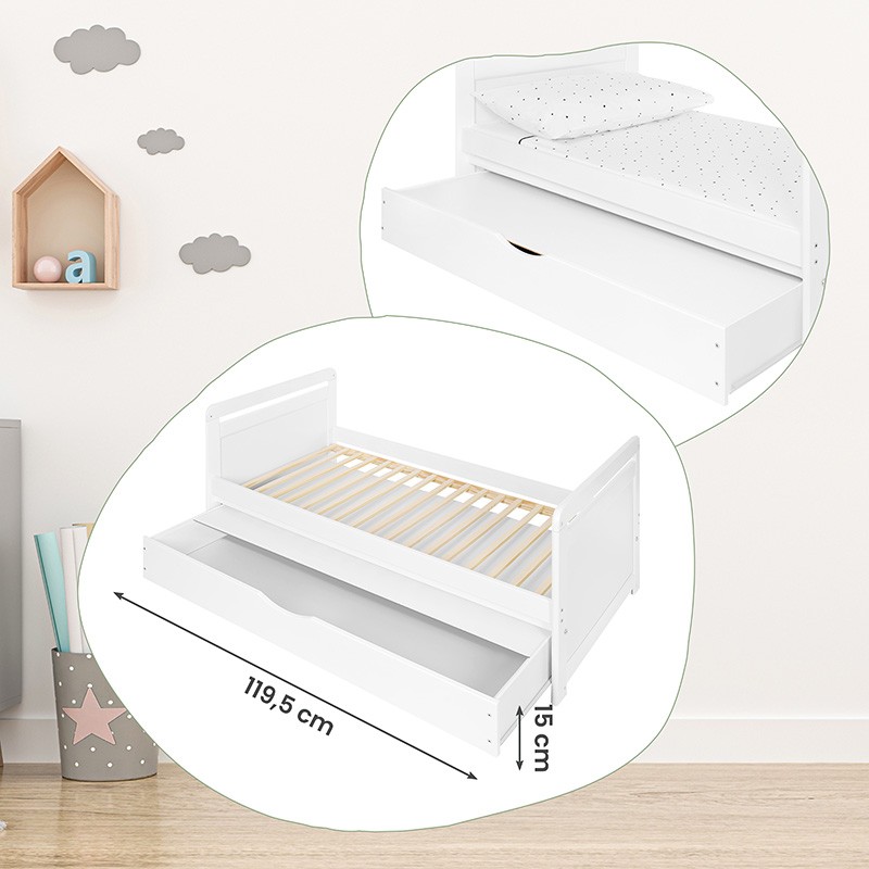 Pătuțul pentru copii este conceput pentru utilizare zilnică și pentru diferite etape de creștere ale copilului. Reglarea bazei pe 3 niveluri și cele 3 bare detașabile permit adaptarea modului de utilizare la vârsta și mobilitatea copilului. Finisajul interesant al detaliilor și posibilitatea de transformare a pătuțului în pat tip canapea extind perioada de folosire a piesei de mobilier. O listelă inferioară de întărire este adaptată pentru montarea unui sertar, astfel încât pătuțul poate fi completat cu spațiu practic de depozitare. Pătuțul este disponibil în culoare albă și este destinat unei saltele de 120 x 60 cm.
