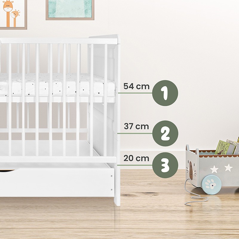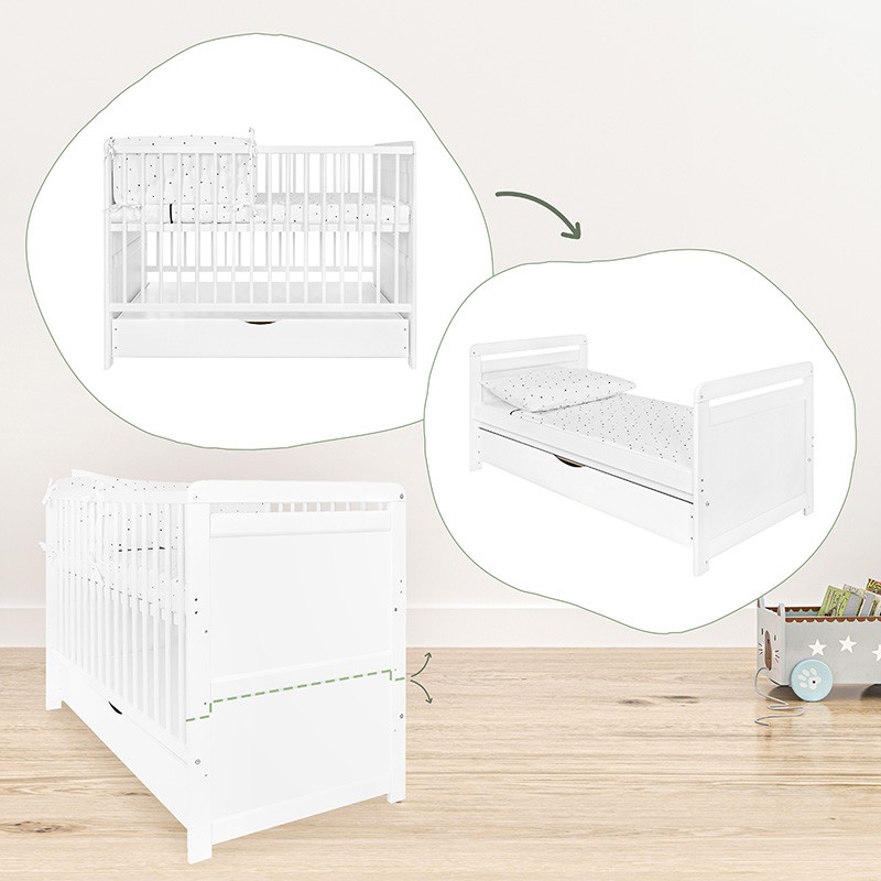 Pătuț pentru copii din lemn de pin clasa I, cu bază reglabilă pe 3 niveluri, 3 bare detașabile, funcție de pat tip canapea și pregătire pentru sertar, în culoare albă, pentru saltea 120 x 60 cm.