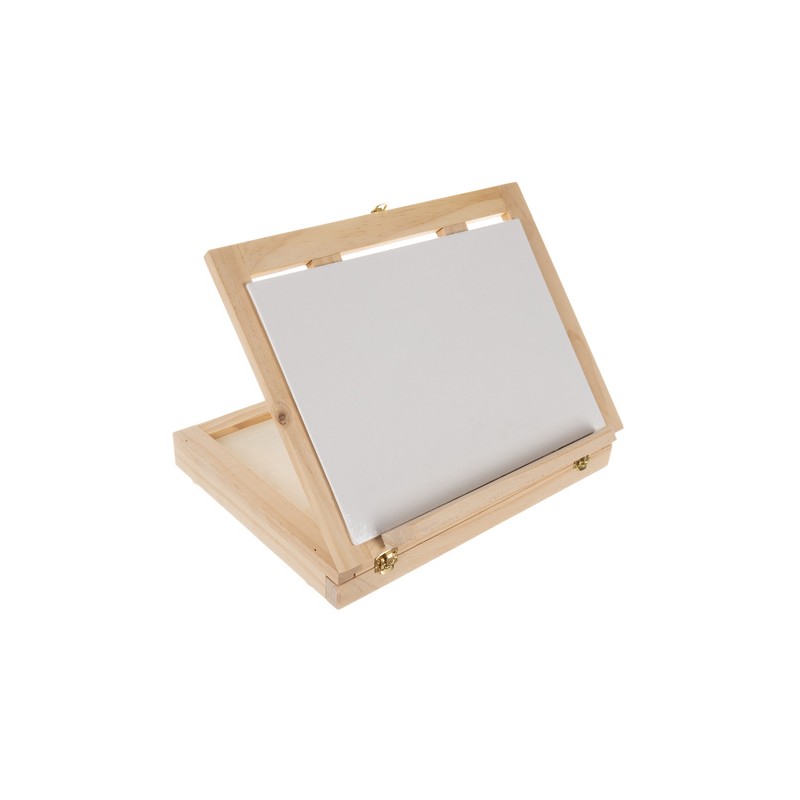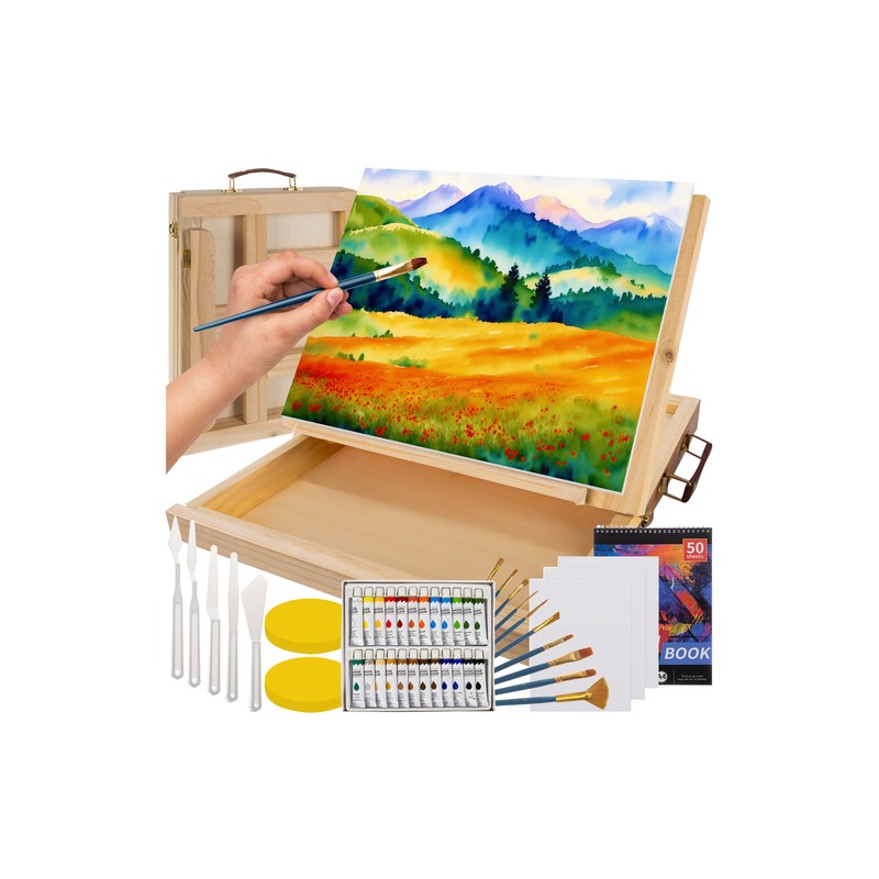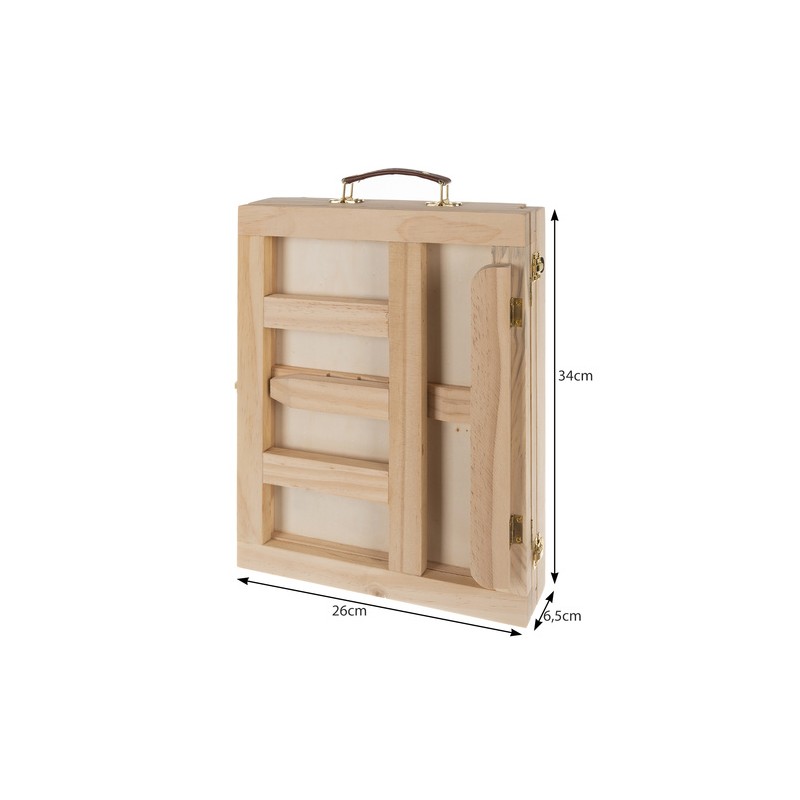 Set de pictură în valiză din lemn cu şevalet: 45 de piese cu acuarele, pensule, paletă, spatule, caiet de schiţe şi 3 pânze. Practic pentru acasă şi şcoală, ideal ca idee de cadou şi pentru începutul unei pasiuni creative.