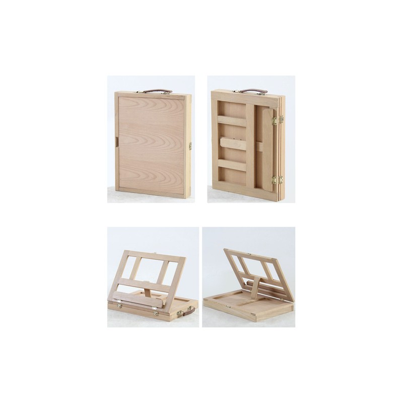 Da, valiza din lemn devine şevalet după deschidere, poate fi aşezată pe masă, iar înălţimea este reglabilă pentru utilizare uşoară.