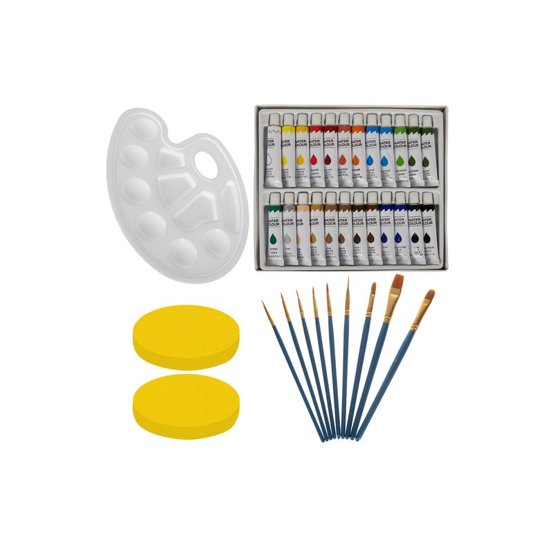 Include acuarele, pensule, paletă, spatule, caiet de schiţe, 3 pânze şi o valiză din lemn care se transformă în şevalet.