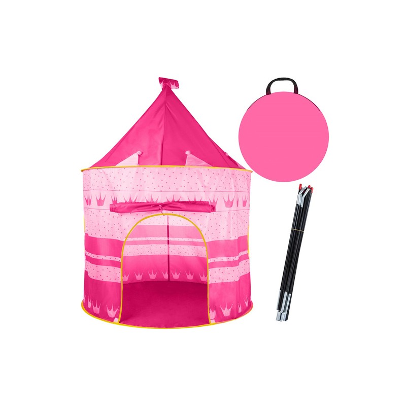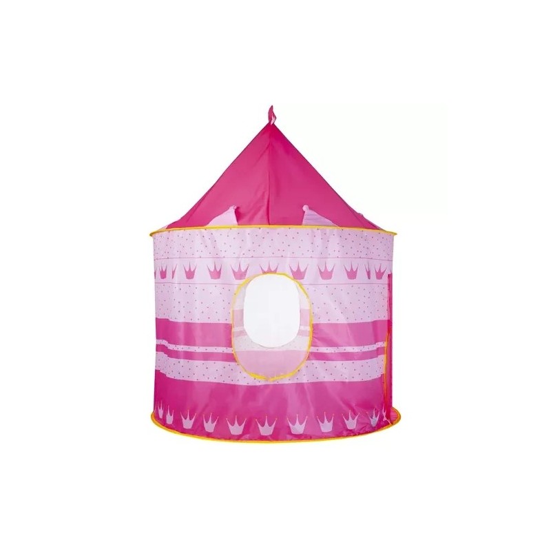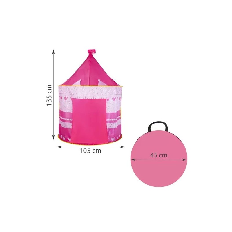 Cort roz tip palat de prinţesă, pentru casă şi grădină - spaţiu sigur pentru joacă creativă şi depozitarea jucăriilor. Se montează rapid, are două ferestre cu plasă şi intrare cu prindere tip arici, plus husă cu mâner pentru transport.