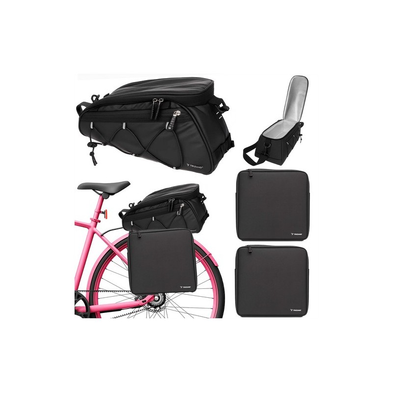 Set de 3 genţi pentru portbagajul bicicletei, rezistente la apă, cu volum de aprox. 16 litri şi geantă centrală cu funcţie termică. Îţi încape mâncare, haine şi lucrurile esenţiale, ai elemente reflectorizante pentru vizibilitate, iar geanta centrală se poate detaşa şi purta pe umăr.