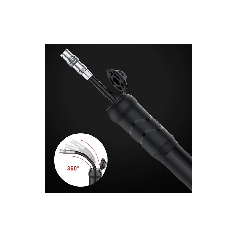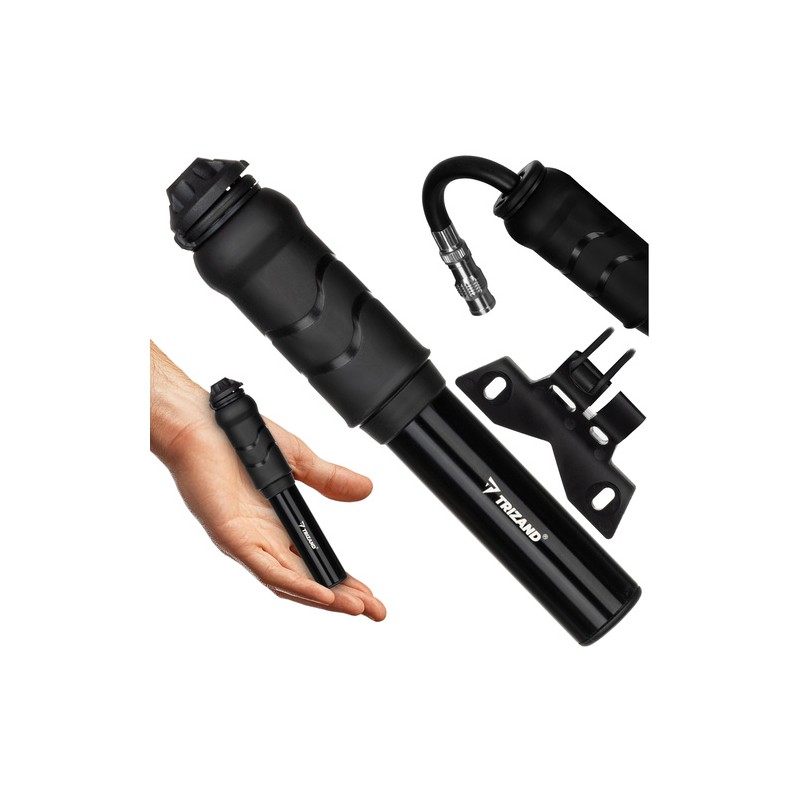 Pompă manuală compactă pentru bicicletă şi trotinetă, cu suport de prindere pe cadru. Ventil universal compatibil Presta/Schrader, furtun flexibil pentru pompare comodă şi presiune până la 7 bar - ideală când ai nevoie de o umflare rapidă.