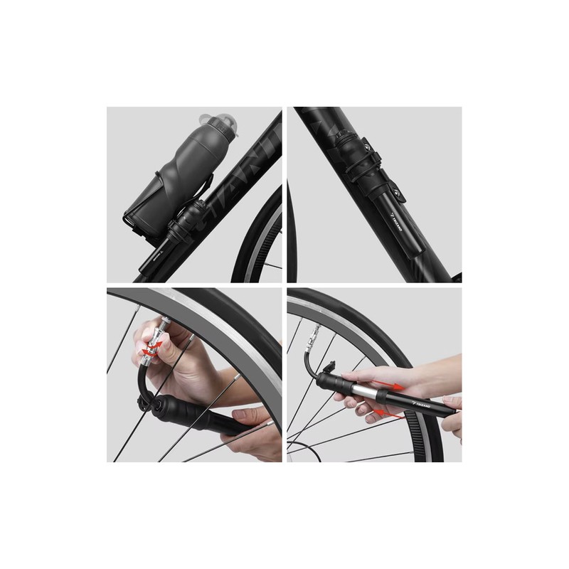 O pompă bună e cea pe care o ai cu tine atunci când contează. Acest model compact se potriveşte uşor în rutina ta: are ventil universal compatibil cu Presta şi Schrader, astfel încât o poţi folosi la majoritatea bicicletelor şi la trotinete. Pomparea este rapidă şi intuitivă, iar furtunul flexibil oferă confort şi ajută la protejarea valvei în timpul utilizării. Cu suportul inclus, o fixezi direct pe cadrul bicicletei şi o ai mereu la îndemână, fără să depinzi de rucsac sau buzunare. Construcţia din aluminiu, realizarea rezistentă la apă şi blocarea împotriva deschiderii accidentale susţin funcţionarea sigură în diverse condiţii. În plus, suportul are cheie imbus integrată, utilă pentru reglaje rapide pe traseu.