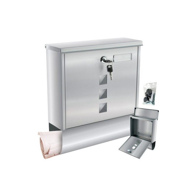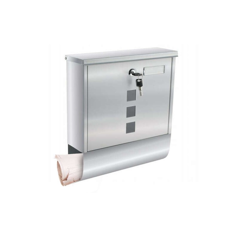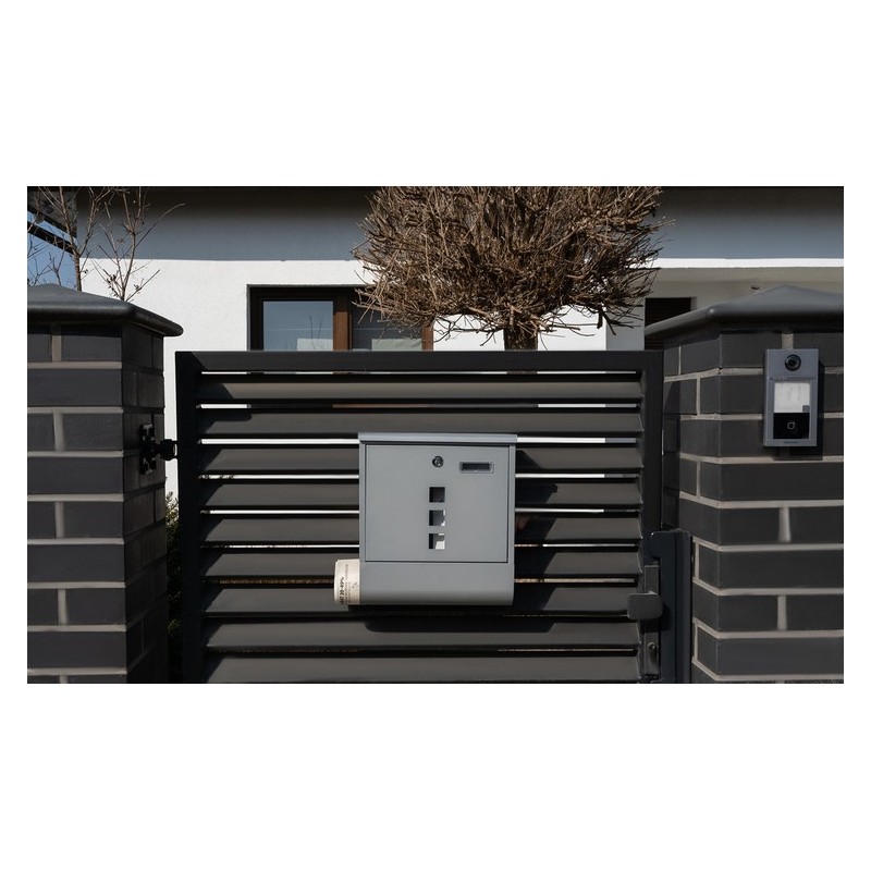 Cutie poştală argintie pentru format A4, cu fantă de introducere acoperită, care protejează corespondenţa de vreme. Include tub inferior pentru ziare şi pliante, plus 2 chei şi accesorii de montaj în pachet.