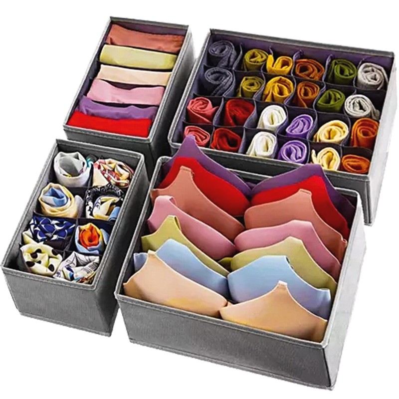 Acest set de patru organizatoare reprezintă soluţia ideală pentru a introduce ordinea în sertarele şi dulapurile dumneavoastră. Gata cu căutarea haotică a obiectelor mici de îmbrăcăminte - acum fiecare lucru are locul său bine stabilit. Obţineţi un acces mult mai rapid la şosete, sutiene, lenjerie intimă sau cravate. Produsul este gata de utilizat imediat, fără a fi necesară montarea, iar atunci când nu sunt folosite, construcţia pliabilă permite o depozitare facilă.
