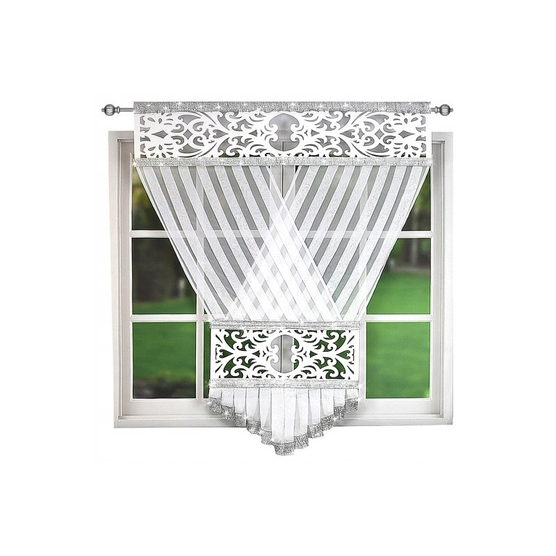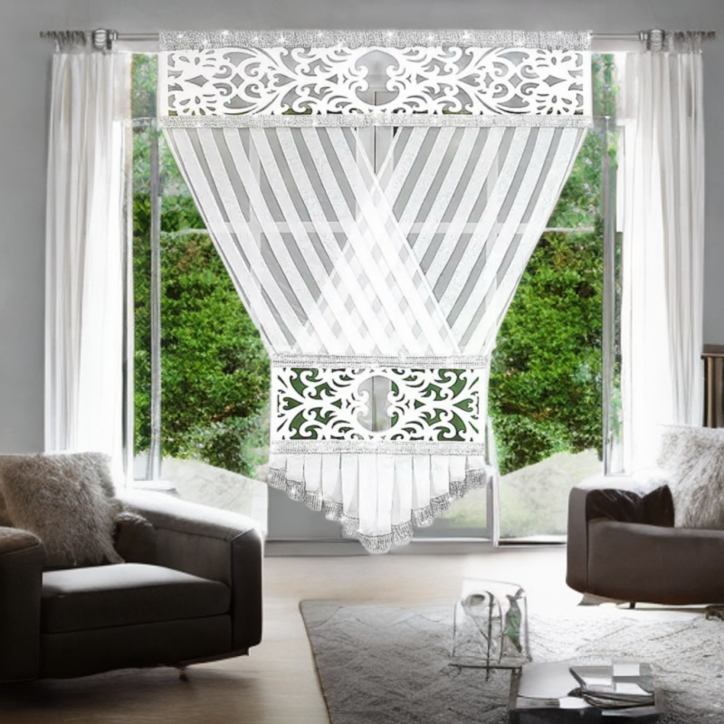 Acest panou decorativ de fereastră adaugă un element elegant şi expresiv în zona ferestrei. Combină voalul, fetrul şi banda decorativă cu cristale, rezultând un efect rafinat, cu aspect de lux, care pune în valoare încăperea. Panoul este conceput pentru a îmbina estetica şi funcţionalitatea - oferă o decorare vizibilă a ferestrei fără aranjamente complicate. Datorită dimensiunilor sale, poate deveni un punct central de decor în diverse spaţii, precum livingul sau alte camere de reprezentare.