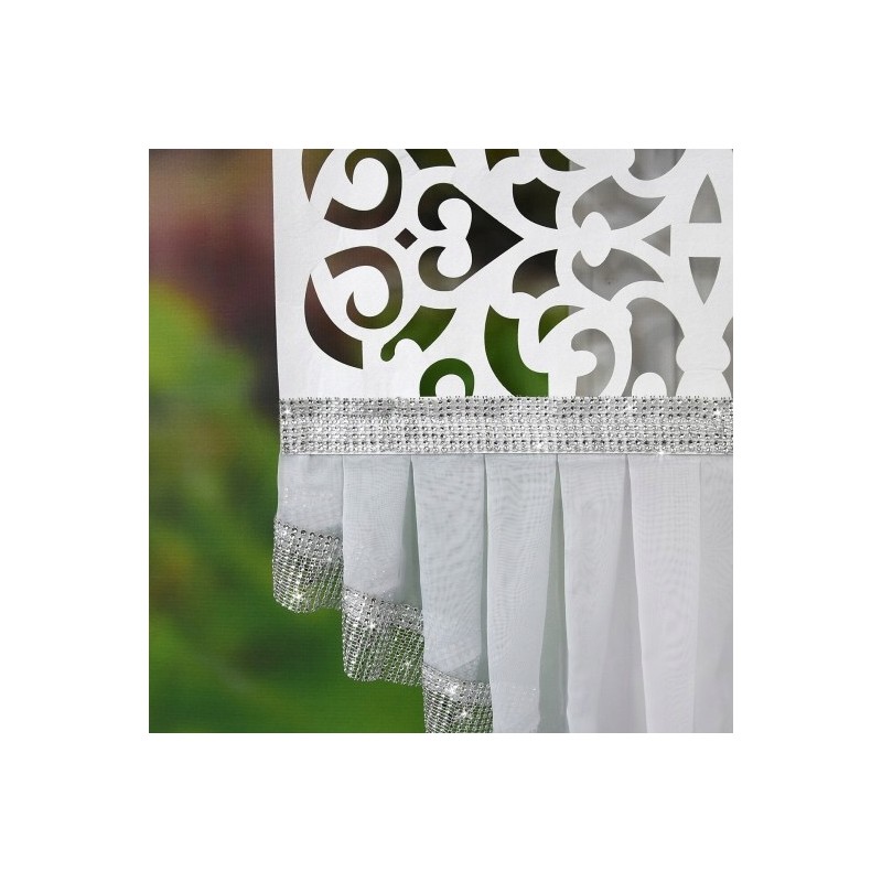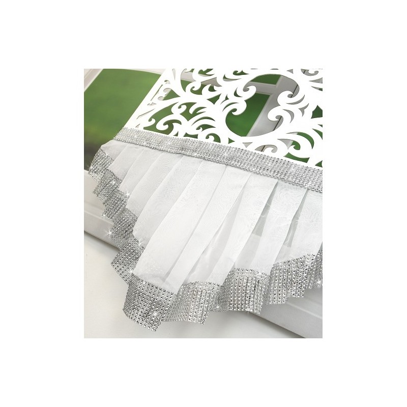 Panou decorativ de fereastră din voal şi fetru alb 120x160 cm, cu bază decupată şi bandă cu cristale, uşor de montat pe galerie tubulară, cu cleme sau cârlige.