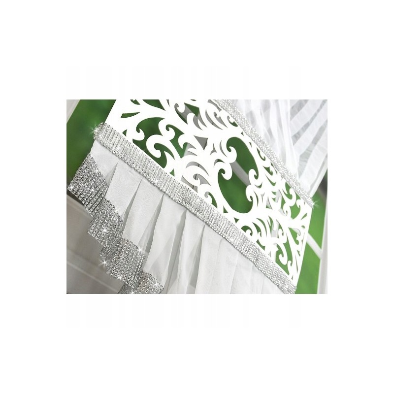 Voalul alb, combinat cu baza din fetru decupat şi banda cu cristale, creează un stil modern şi elegant. Partea inferioară cu model ajurat oferă lejeritate şi fineţe, iar cristalele adaugă un accent strălucitor şi vizibil. Panoul se potriveşte în interioare în care contează detaliile bine lucrate şi îmbinarea elementelor clasice cu cele contemporane. Datorită culorii albe neutre, poate fi integrat uşor în scheme cromatice diferite, fără a încărca vizual spaţiul.