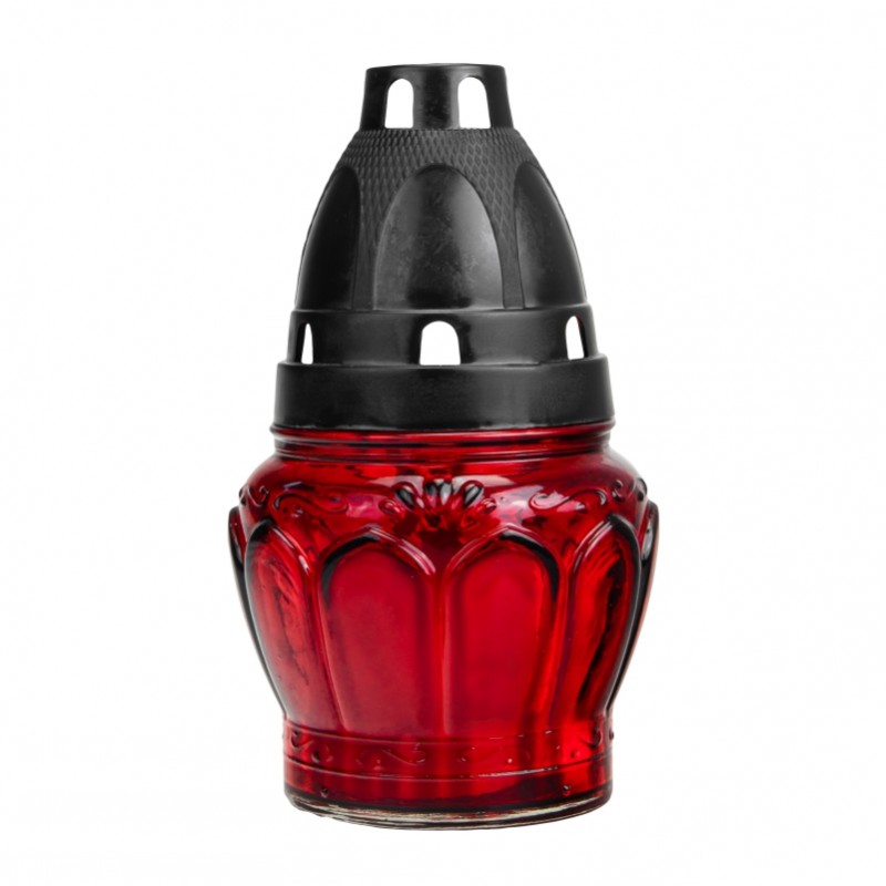 Grație sticlei solide împodobite cu model, candela are un aspect elegant, fiind totodată rezistentă la condițiile atmosferice. Baza stabilă și construcția solidă îi garantează siguranța în folosire. Setul include o inserție cu un timp de ardere de până la 14 ore, care asigură o lumină clară de lungă durată. Culoarea intensă a sticlă scoate în evidență semnificația momentului și face ca flacăra să fie deosebit de vizibilă, chiar și de departe.