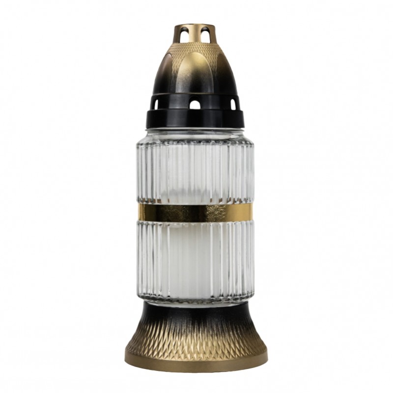 Candela de sticlă cu inserție este o combinație clasică de eleganță și considerente practice. Sticla riflată, stilată, cu dungă decorativă aurie și un soclu solid în nuanțe de negru și auriu, fac din aceasta candelă un accesoriu încântător ce subliniază caracterul solemn al clipei.