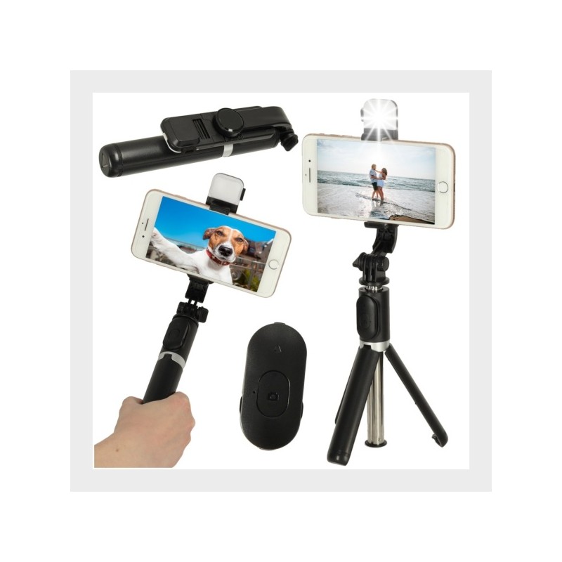 Selfie stick-ul cu trepied este un accesoriu practic pentru oricine face fotografii şi videoclipuri cu telefonul. Permite surprinderea unor cadre mai largi şi a unor unghiuri creative, atât din mână, cât şi după deschiderea celor trei picioare stabile ale trepiedului. Telecomanda Bluetooth integrată în mâner îţi permite să declanşezi fotografia în momentul potrivit, fără să atingi telefonul. Lampa LED cu 8 diode îmbunătăţeşte lumina, iar cele 6 moduri de iluminare şi alegerea între lumină rece sau caldă ajută la adaptarea iluminării la condiţiile din jur.