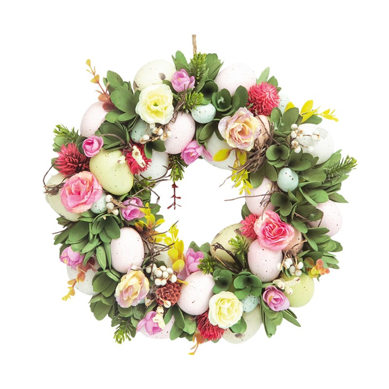 O coroniţă de Paşte elegantă, cu diametrul de 30 cm, ce îmbină motivele clasice cu flori şi ouă într-o reinterpretare modernă. Această decoraţiune rezistentă va aduce un aer proaspăt de primăvară pe uşa, peretele sau şemineul dumneavoastră, timp de mai multe sezoane.