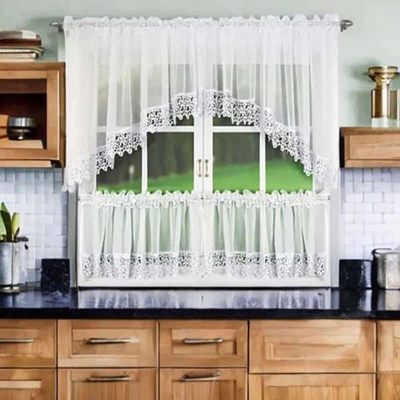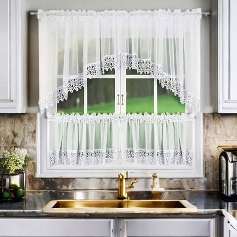 Include o perdea cu dantelă tip gipure şi două perdele scurte separate, pentru o decorare completă a ferestrei din bucătărie.