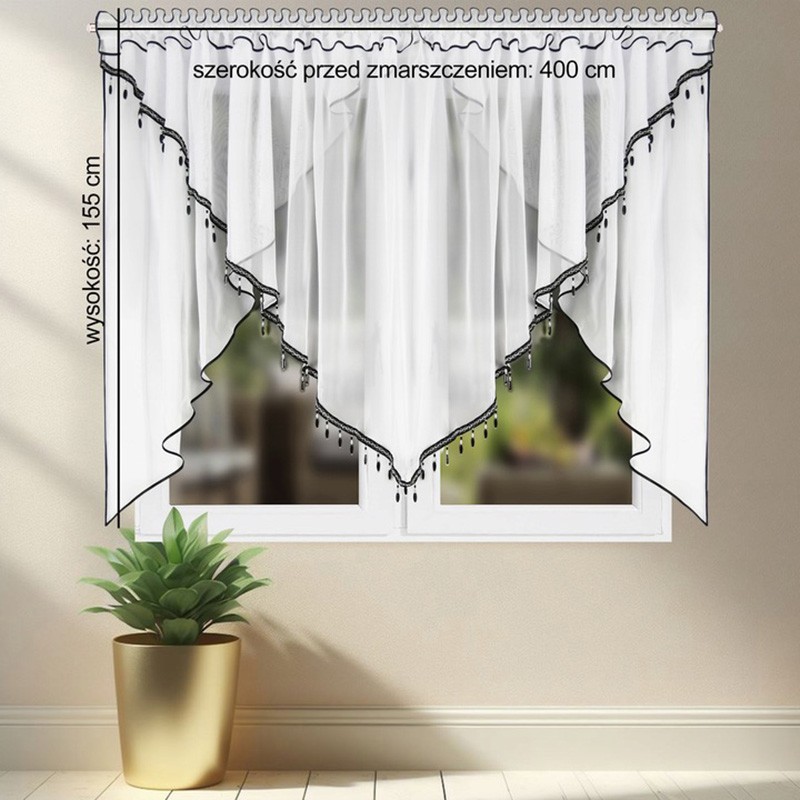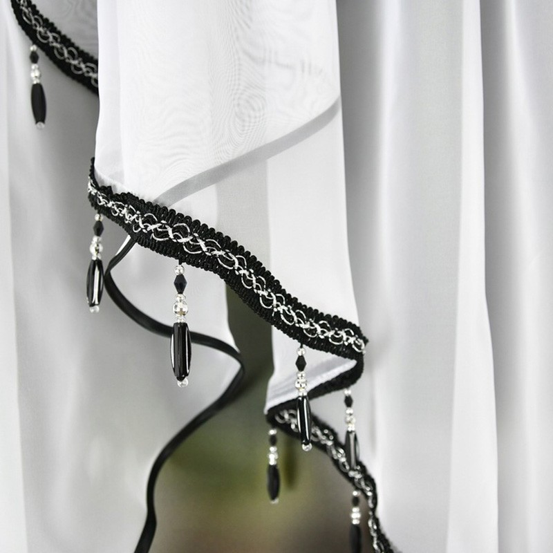 Este genul de decor care schimbă imediat atmosfera din cameră. Voalul alb, lejer, difuzează lumina şi aduce un aer luminos şi elegant, iar mărgelele oferă un accent strălucitor care atrage privirea. Designul în două straturi pune în valoare fereastra şi se potriveşte atât în amenajări moderne, cât şi clasice. Bordura neagră conturează finisajul şi adaugă un contrast modern, care scoate perdeaua în evidenţă. Ideală pentru living, dormitor sau un birou elegant.