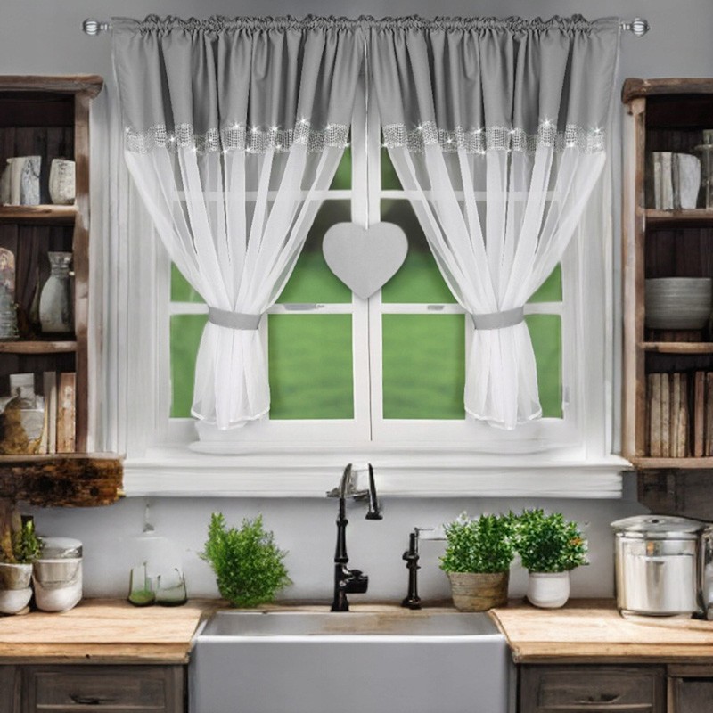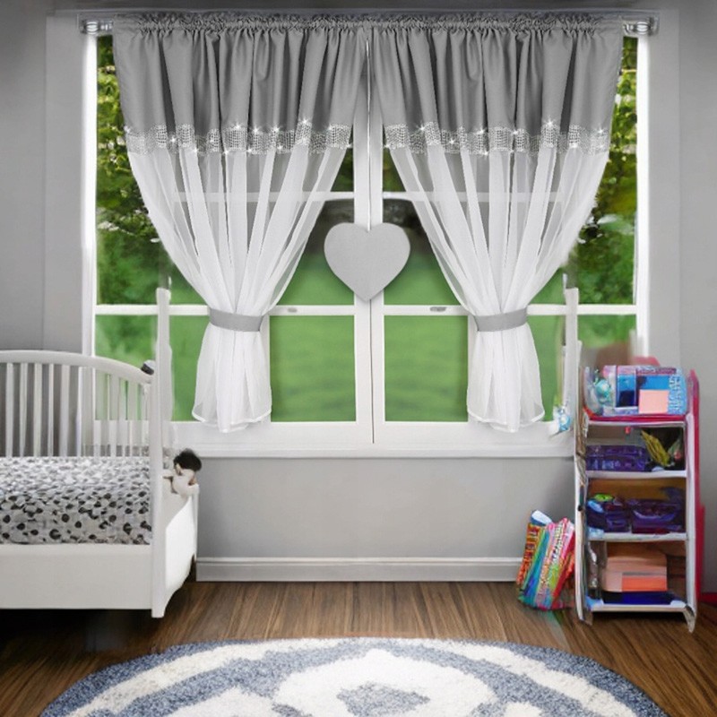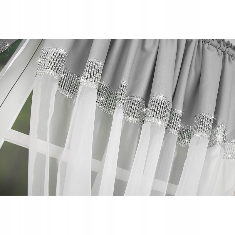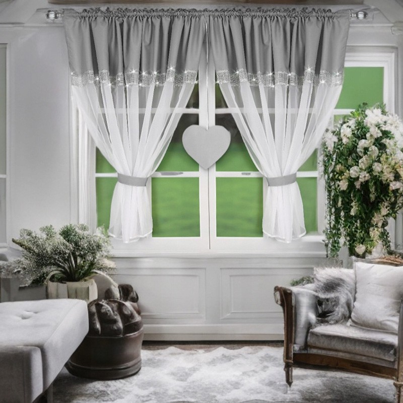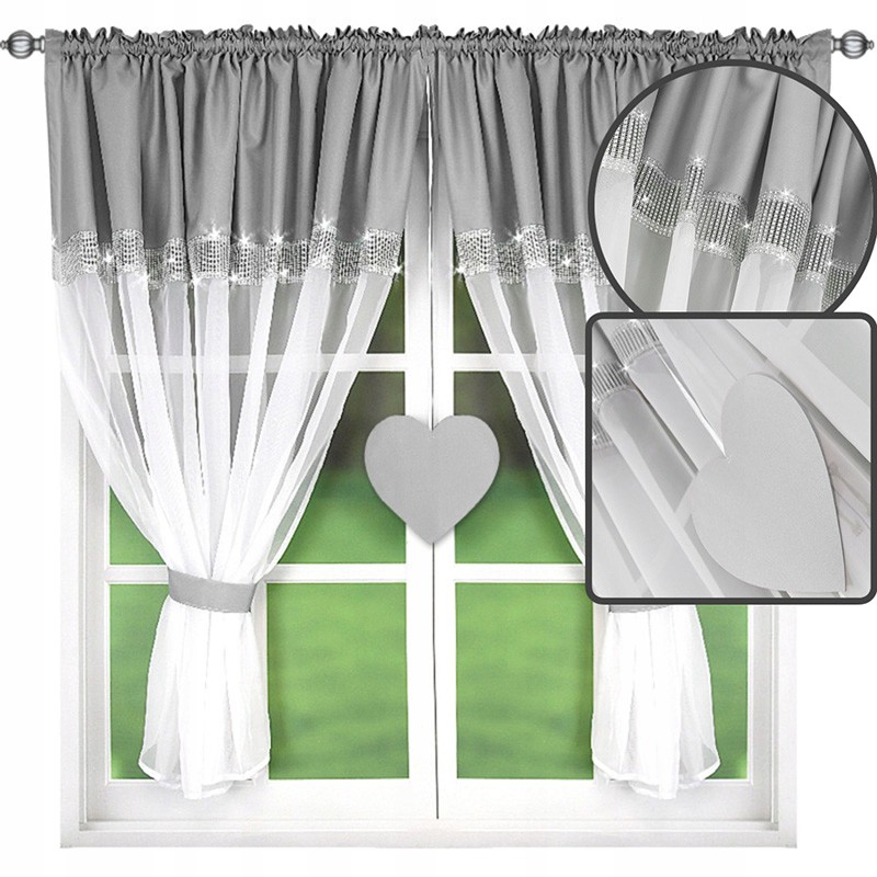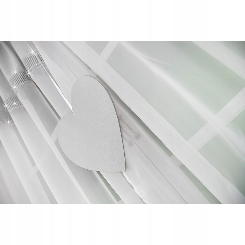 Perdea din voal gri-alb, cu motiv de inimă şi pietre strălucitoare, care adaugă luminozitate şi un farmec aparte. Uşoară, decorativă şi spectaculoasă pe ferestre mari - ideală pentru dormitor, living sau camera copilului.