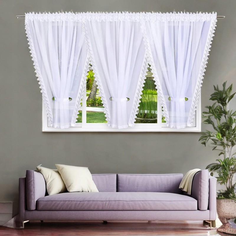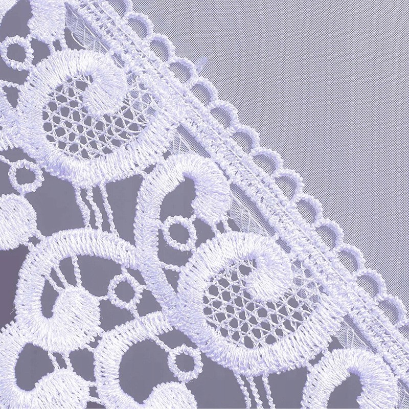 Perdea modernă din voal, finisată cu dantelă tip gipure, care filtrează frumos lumina şi adaugă eleganţă spaţiului. Uşor de întreţinut, potrivită pentru living, dormitor sau birou.
