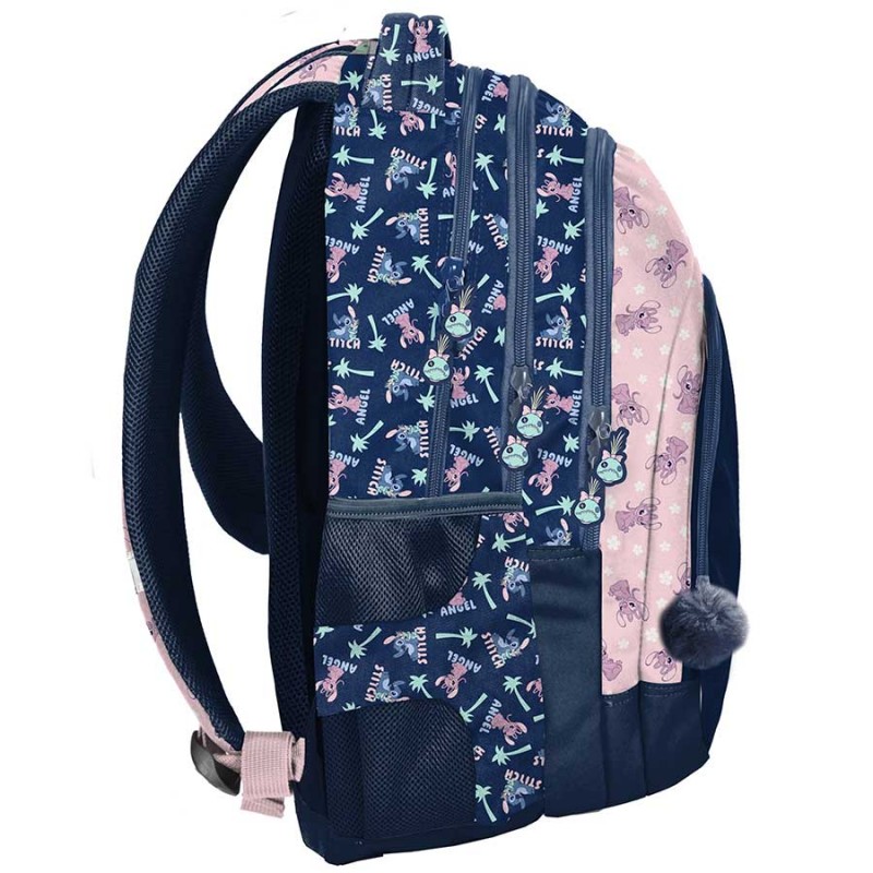 Ghiozdanul şcolar Stitch & Angel - trei compartimente încăpătoare, un buzunar frontal cu organizator şi buzunare laterale. Spate profilat, bretele moi, fund rigid şi elemente reflectorizante. Ideal pentru mers la şcoală şi pentru fiecare zi. O soluţie funcţională şi modernă pentru elevii care au nevoie de un ghiozdan încăpător şi comod. Prevăzut cu trei compartimente încăpătoare, permite o organizare perfectă a manualelor, caietelor şi accesoriilor de şcoală. În compartimentul principal se găseşte un separator pentru laptop sau pentru documentele mai mari, iar cel de-al doilea compartiment are un organizator practic cu un buzunar cu fermoar şi o agăţătoare pentru chei. Ghiozdanul mai are un buzunar frontal şi două buzunare laterale - unul din plasă şi unul din material - ideale pentru sticla sau bidonul de apă şi pentru alte mărunţişuri. Spatele întărit, profilat, şi bretelele moi asigură confortul în timpul purtării, iar fundul rigid protejează conţinutul de deteriorare. Cazanul are şi un mâner pentru a fi purtat cu uşurinţă, o urechiuşă pentru agăţat şi elemente reflectorizante care măresc siguranţa copilului în drumul său spre şcoală.