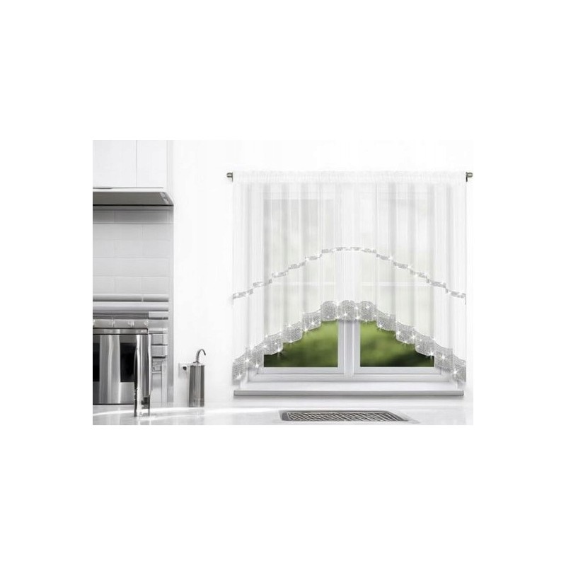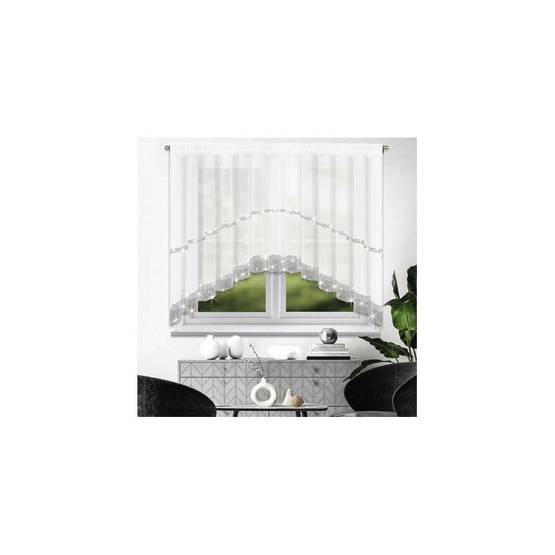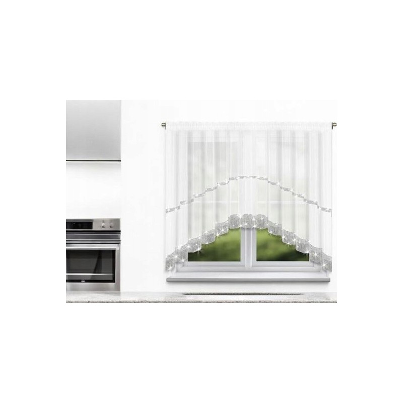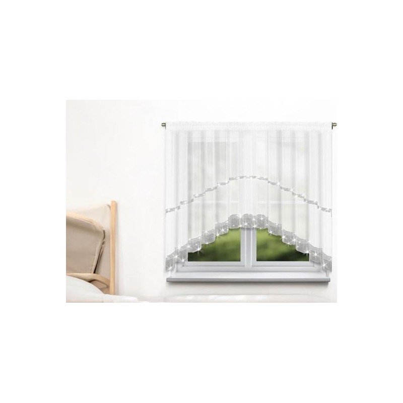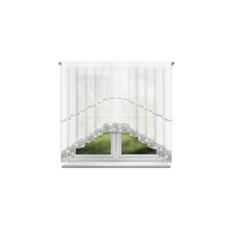 Această perdea albă din voal, croită în arc, îmbină eleganţa cu un stil modern şi de efect. Forma de arc o diferenţiază de modelele clasice şi o transformă rapid în punctul central al decorului ferestrei. Cristalele argintii strălucitoare adaugă un plus de rafinament şi atrag privirea. Dimensiunea de 400x150 cm este potrivită pentru diverse tipuri de ferestre, iar atenţia la detalii oferă un rezultat decorativ deosebit de plăcut.