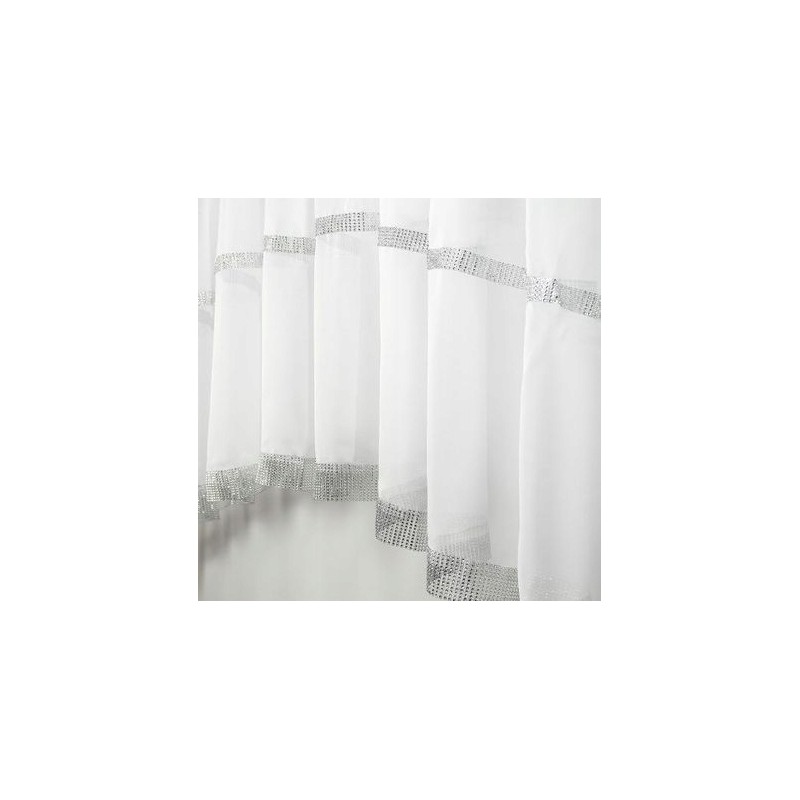 Perdeaua este confecţionată din voal alb de înaltă calitate, 100% poliester, care se aşază frumos pe toată lăţimea galeriei. ?esătura se remarcă prin aspect estetic şi durabilitate în utilizarea de zi cu zi. Banda universală de încreţire permite montarea pe galerie tubulară, cu cleme sau cârlige şi ajută la ajustarea lăţimii de încreţire la dimensiunea galeriei. Două rânduri de cristale argintii elegante - o bordură decorativă de aproximativ 6 cm la marginea inferioară şi un ornament mai discret în zona centrală - subliniază finisajul atent. Perdeaua este uşor de întreţinut: se poate spăla la maşină la 30°C, se poate călca până la 110°C, fără înălbitori şi fără curăţare chimică, respectând indicaţiile de pe produs.