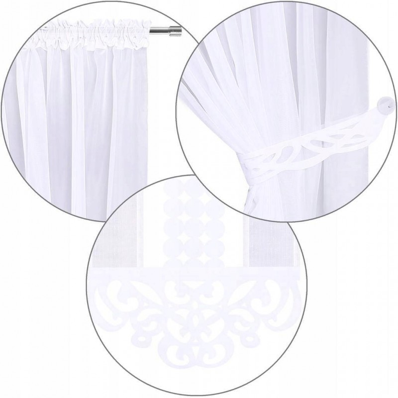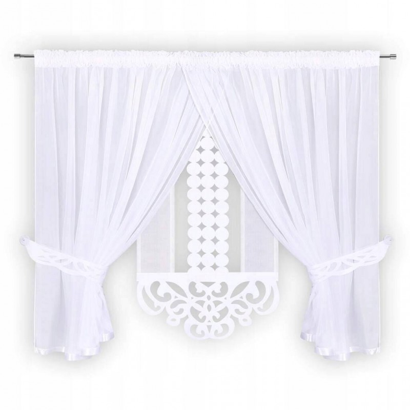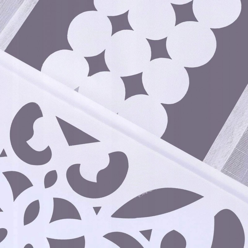 Acest set decorativ elegant combină o perdea albă din voal, gata de montat, cu un panou decorativ cu model decupat, obţinut prin tăiere laser, oferind un cadru expresiv pentru fereastră. Structura în două piese facilitează montarea pe două galerii şi ajută la obţinerea unei aranjări armonioase a întregii zone vitrate. Voalul alb, neted şi plăcut la atingere, lasă lumina să pătrundă în interior, protejând în acelaşi timp intimitatea locatarilor. Setul este realizat cu atenţie la detalii, astfel încât fereastra capătă un aspect ordonat şi rafinat fără a fi nevoie de combinarea separată a elementelor.