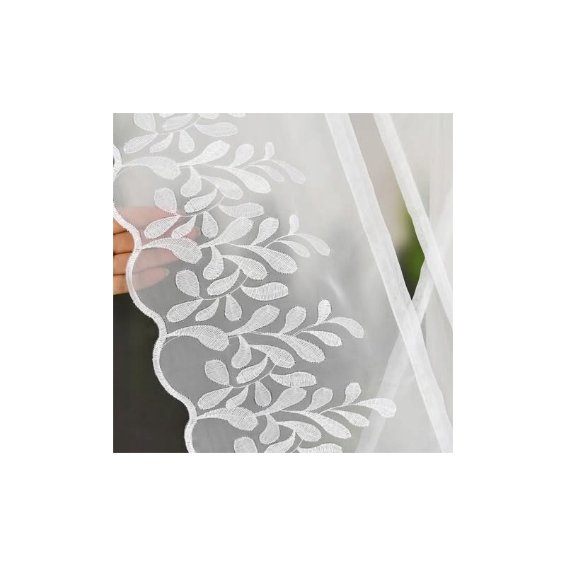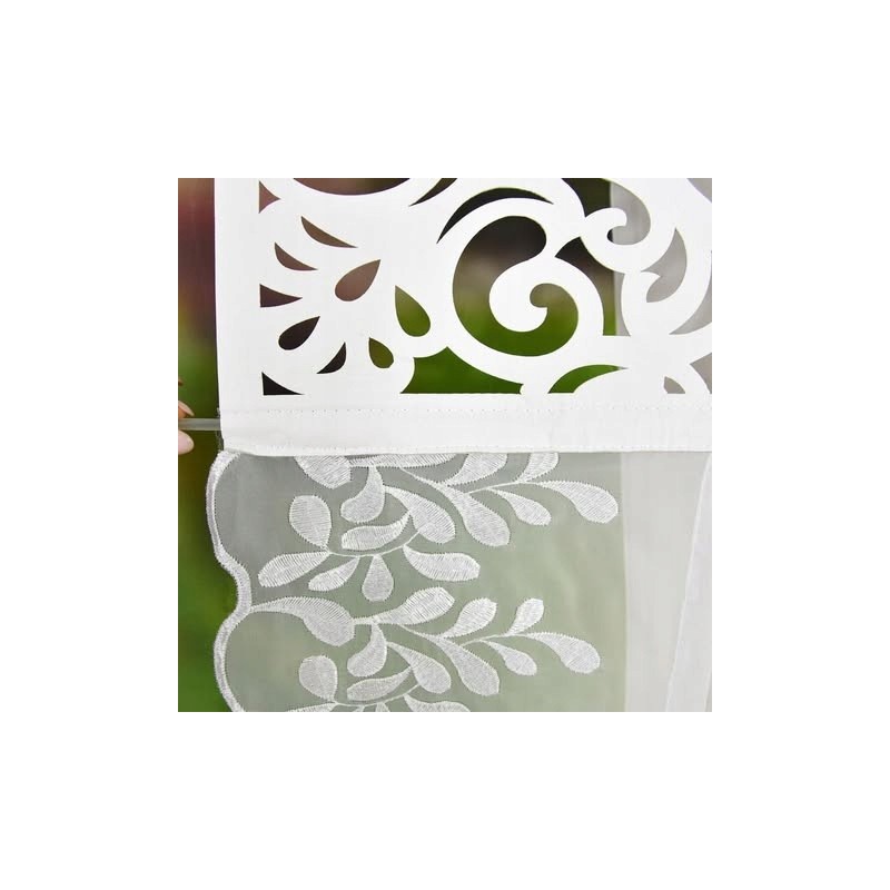 Panoul este realizat din voal delicat şi fetru, completate de o bandă decorativă cu cristale. Voalul asigură un efect semitransparent şi aerat, în timp ce fetrul oferă bază stabilă pentru modelul ajurat de culoare argintie. Conform descrierii, materialul textil este din poliester rezistent la întindere şi şifonare, ceea ce susţine durabilitatea şi păstrarea formei. Decorul este pus în valoare prin broderie şi elemente cu cristale, iar partea superioară este finisată pe bandă, facilitând plierea şi aranjarea uniformă pe galerie. Întreţinerea este simplificată prin posibilitatea de spălare la maşină cu respectarea recomandărilor, iar temperatura maximă de călcare este de 110?C, conform informaţiilor din descriere; detaliile de îngrijire se bazează pe indicaţiile producătorului.