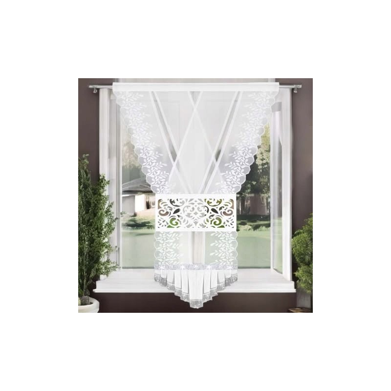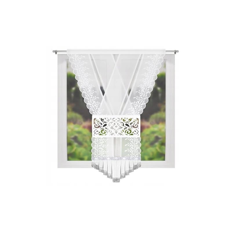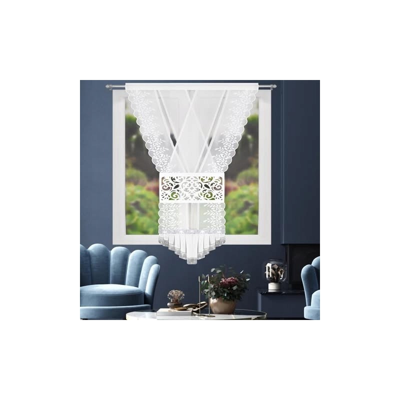 Acest panou decorativ de fereastră combină designul modern cu o utilizare practică, oferind o soluţie rapidă pentru a schimba atmosfera din încăpere. Asocierea voalului uşor, a fetrului cu model ajurat şi a benzii cu cristale creează o decorare elegantă care susţine stilul glamour. Descrierea prezintă panoul ca o decoraţiune inovatoare pentru fereastră, potrivită atât în interioare moderne, cât şi clasice, aducând un plus de rafinament. Dimensiunile panoului permit utilizarea acestuia ca element central în zona ferestrei sau a uşilor către balcon, accentuând partea reprezentativă a încăperii.