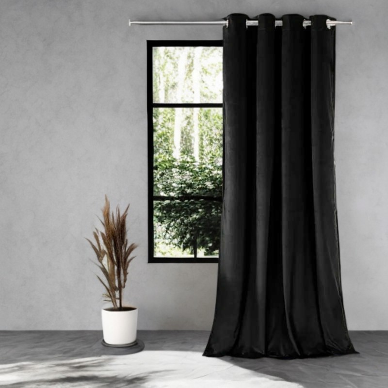 Draperie din velur glamour 140x250 cm într-o nuanţă închisă (grafit/negru), din velur moale 180 g/m?, cu inele şi bandă, ideală pentru atenuarea luminii şi mai multă intimitate.