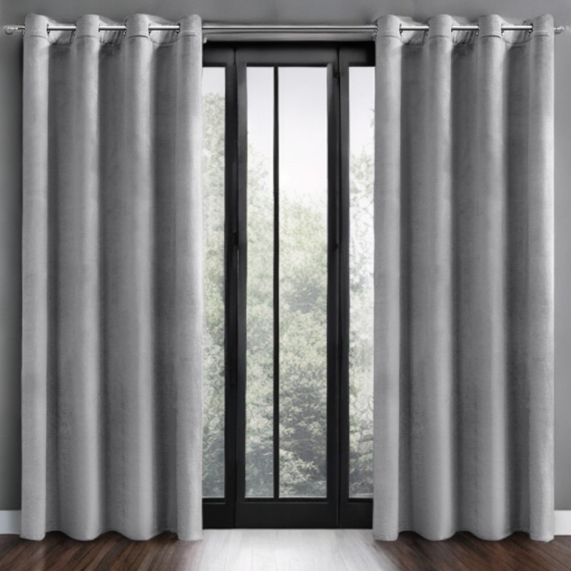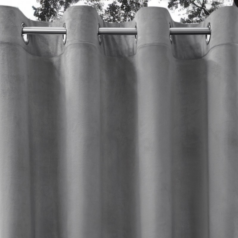 Draperie din catifea stil glamour, în nuanţă de gri deschis, 140 x 230 cm, cu inele pentru galerie, care filtrează lumina, oferă intimitate şi adaugă interiorului un aspect elegant şi primitor.