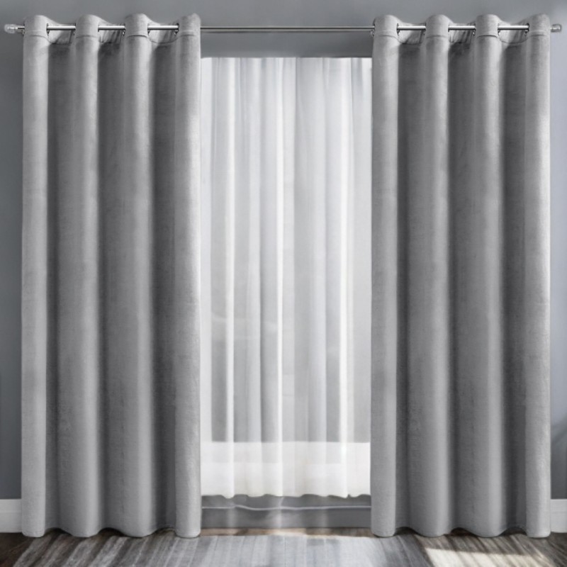 Draperie din catifea stil glamour, în nuanţă gri deschis, 140 x 250 cm, cu inele pentru galerie, care filtrează lumina, oferă intimitate şi adaugă interiorului un aspect elegant şi primitor.